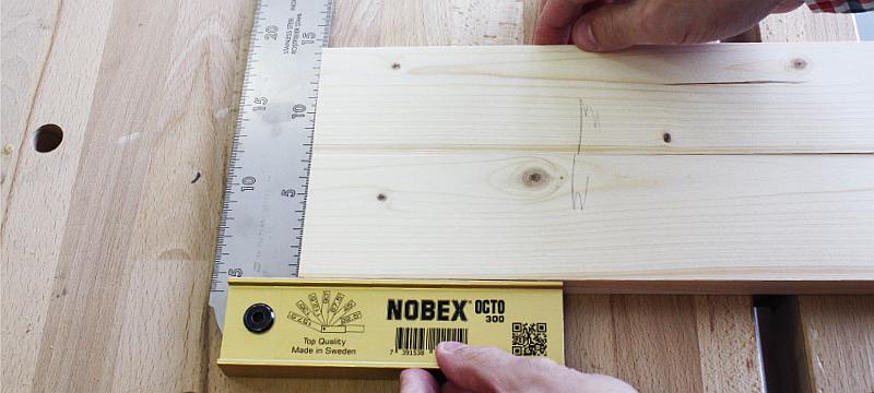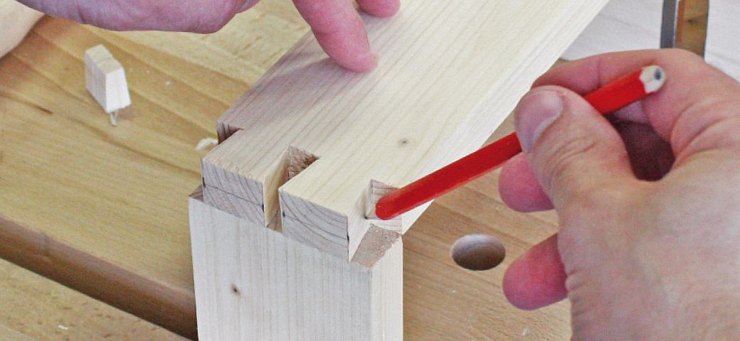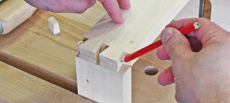 Nyní je třeba vytvořené čepy překreslit na hranu druhého dílce. Upněte dílec na výšku hoblíku a pak ho použijte na podložení. Dílec se spojem položte na hranu a na hoblík. Tenkou tužkou nebo rýsovacím nožem překreslete čepy.