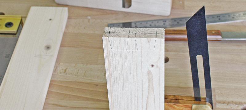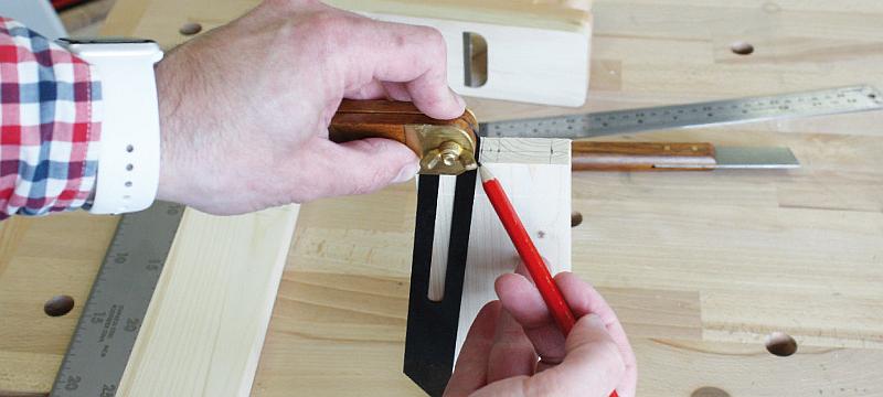 Prvním krokem je vytvoření linky označující hloubku rybinového spoje. Rýsovaná linka by měla být o menší kousek dál od kraje, než je tloušťka dřeva, což umožní malý přesah při následném sestavování spoje.