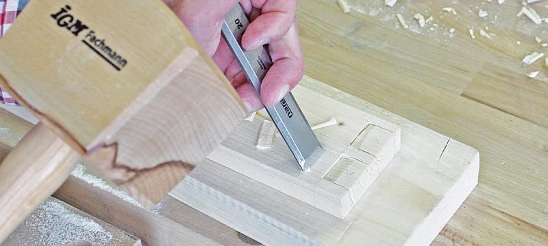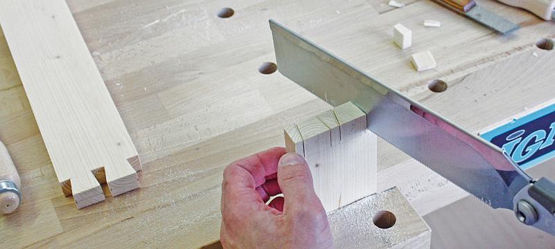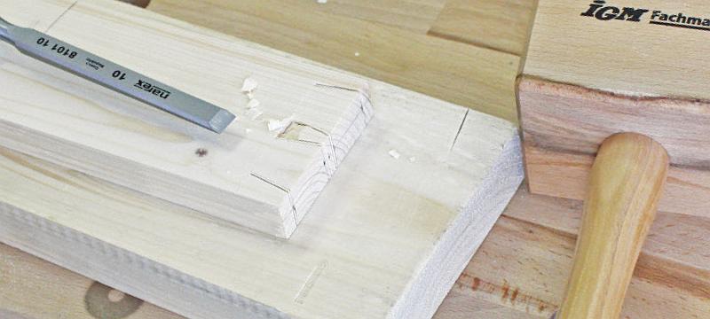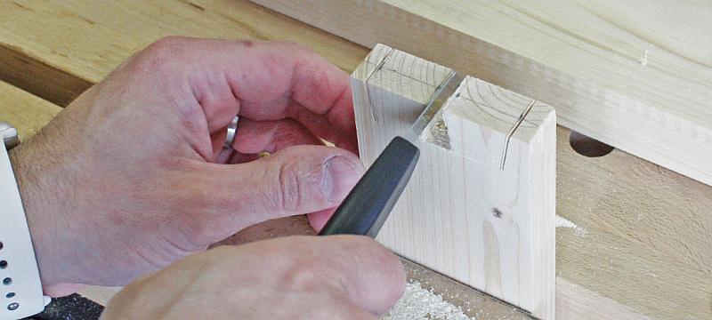 Po vyřezání čepů je čas na vyčištění prostoru mezi čepy a odříznutí jejich kraje. Na vyčištění použijeme opravdu ostré dláto a paličku, případné nedostatky dočistíme doříznutím. Vyčištění je možné také lupínkovou pilou, přičemž si nechte 1 mm nebo méně, tento zbytek pak opatrně odstraníte dlátem.