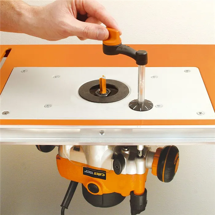 U obou typů CMT frézek lze nastavit výšku frézování ve frézovacím stolku shora pomocí ruční kliky.