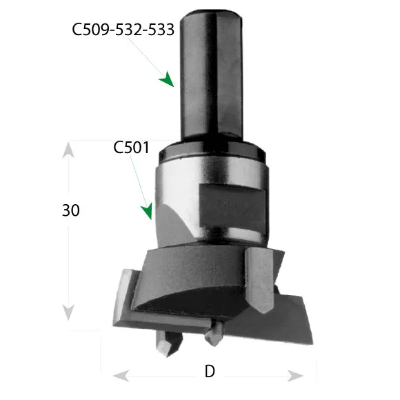 Šroubovací verze sukovníku CMT, která zrychluje výrobní časy.Stopka může být neustále upnuta ve vrtačce ve stejné pozici.Našroubováný sukovník dosedne přesně do stejné pozice jako vyměněný kus a proto nemusíte znovu nastavovat hloubku na stroji. Má 2 předřezávací hroty, centrovací hrot a 2 řezné zuby.Všechny hroty jsou z tvrdokovu určeného pro vrtání do měkkého i tvrdého dřeva.Pro stacionární vrtačky.