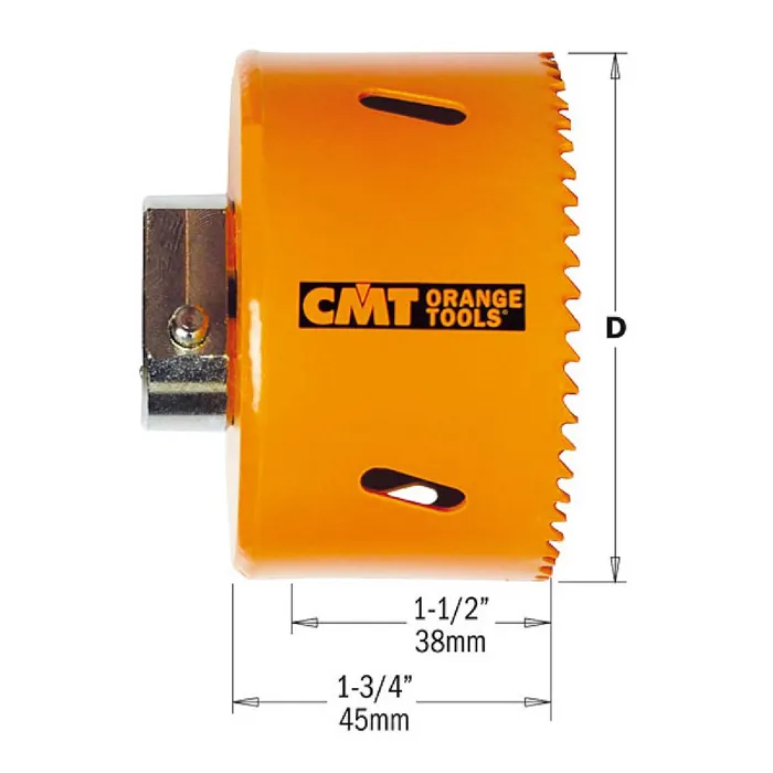 Inovativní systém CMT nabízí velké výhody všem profesionálům.X1 RYCHLÉ UPNUTÍ - VŠE NA JEDNO CVAKNUTÍ!Vyvinuli jsme jedinečný patentovaný Fast Lock systém pro rychlou výměnu mezi velikostmi a typy během několika vteřin!Jediný systém, který umožňuje vyměnit vrtací korunku a středící vrták bez použití jakýchkoli nástrojů.X2 RYCHLÉ VRTÁNÍ - RYCHLÉ VRTÁNÍ V KAŽDÝCH PODMÍNKÁCH.Vrtejte rychle a přesně i pod úhlem pomocí jedinečné geometrie těla a skvěle naostřeným zubům.• předvrtejte otvor pod požadovaným úhlem• nasaďte korunku zpět do přední polohy a dokončete vyvrtání otvoruX3 RYCHLÉ ZVĚTŠENÍ OTVORU - JEDINEČNÉ ŘEŠENÍ PRO ZVĚTŠENÍ OTVORU!CMT přichází s unikátním rychlým zvětšením otvoru. Na speciální vrták můžete nasadit 2 korunky, a vyvrtat tak širší otvor během několika vteřin.X4 JEDNODUCHÉ VYJMUTÍ ZÁTKY - SNADNO VYJMĚTE ZÁTKU Z KORUNKY JEDNÍM STISKNUTÍM!Už žádné šroubováky nebo jiné nástroje!Zátku bez námahy vyjměte obrácením středícího vrtáku.OtáčkyVrtání při vyšších než doporučených otáčkách zkracuje životnost korunkových vrtáků a vytváří nekvalitní otvory.Tlak na materiálPři vrtání vyvíjejte takový tlak, aby došlo k dostatečnému odvodu špon. Pokud se korunkový vrták přehřívá nebo špony z materiálu ucpávají otvor, tlak snižte. Nedostatečný tlak předčasně otupuje zuby, naopak příliš velký tlak může zuby zcela zničit.Chladící olejChladící olej slouží při vrtání kovů k několika účelům:• ochlazuje vrták a obrobek• snižuje vznik tepla a opotřebení, které zkracují životnost vrtáku• napomáhá odstranit špony• použitím chladícího oleje prodloužíte životnost vrtací korunky až o 500%Materiály:• kovy (pevnost až 1000 N/mm2)• měkká ocel• nerezová ocel• neželezné kovy, hliník• sendvičové materiály• litina• měď, pozinkovaný plech, mosazParametry:• Zuby: střídavě a stranově rozvedené zuby• Celková délka: 45 mm• Řezná hloubka: 38 mm• Doporučené otáčky: kov 550 ot./min. (chlazení olejem) nerezová ocel 270 ot./min.(chlazení olejem) litina 370 ot./min. (vrtání bez chlazení) hliník 800 ot./min. (chlazení terpentýnovým olejem)• Příklep mějte při použití korunkových vrtáků vždy vypnutý.