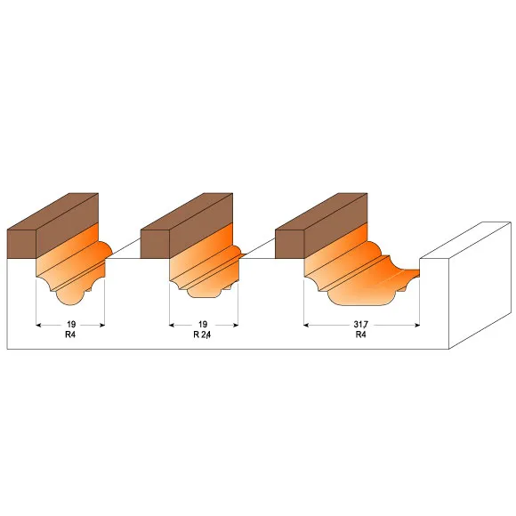 Široká nabídka profilových fréz CMT je určena pro výrobce skříněk a nábytku. Dodáváme 14 různých profilů na hrany stolů, obložení dveří nebo okrasné lišty. Každá profilová fréza může být upravena pro výrobu dvou profilů pouhou výměnou ložiska. Při výměně ložiska zkontrolujte, zda pravá strana černé podložky ložiska odpovídá otáčení ložiska. Nesprávná montáž může způsobit vypadnutí šroubu.