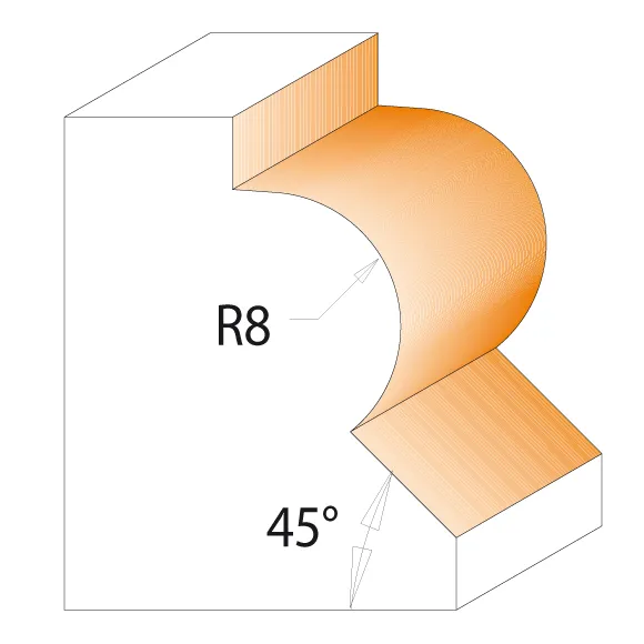 • HM tvrdokovové břity. • Provedení proti zpětnému rázu ANTI-KICK. • Oranžový teflonový potah. Použití: Pro zaoblení hran na stupních schodů, okenních parapetech a policích. TIP:Pro lepší vzhled použijte frézu s průměrem okraje větším než je tloušťka materiálu.