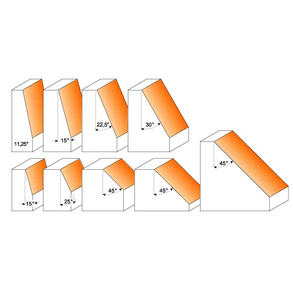 • HM tvrdokovové zuby. • Oranžový teflonový nepřilnavý potah. • Kopírovací ložisko. Použití: Snadná výroba mnohoúhelníkových dílů. Frézují čisté a přesné úkosy pro výrobu dokonale vyrovnaných mnohostranných kontejnerů, krabic a dalších dekorativních předmětů. Mohou být použity s výbornými výsledky pro celou řadu prací, jako je výroba příček a sloupků. TIP: Je možno použít celou délku řezné hrany. Pravidelně nastavujte výšku frézy, aby byl maximálně využit celý HM tvrdokovový břit.