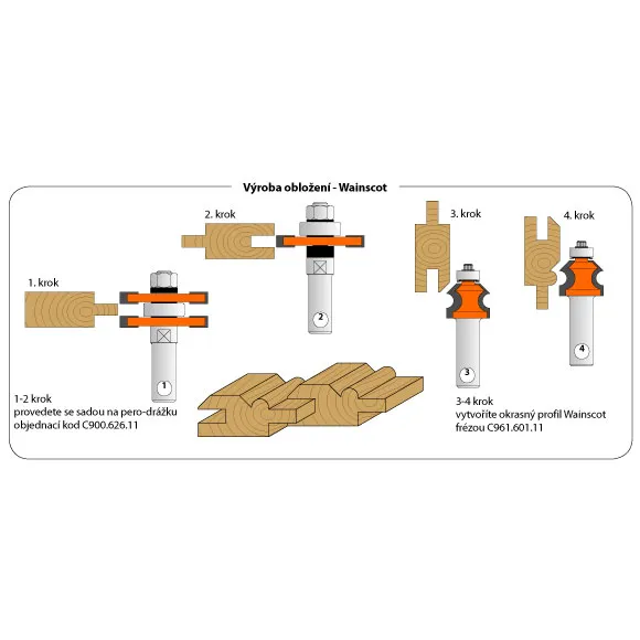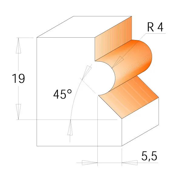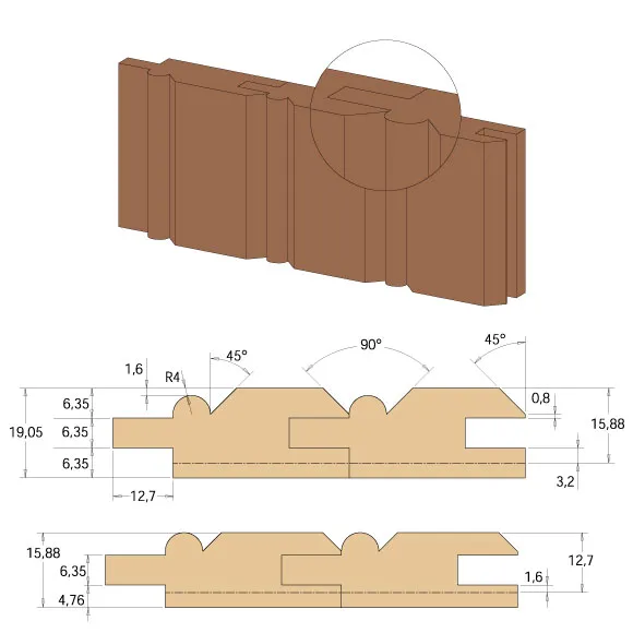 Zcela nová fréza je určena pro výrobu dekoračních obkladů interiérů. Jednoduše vytvoříte spoj na pero-drážku s okrasným rádiusem R4mm. Ideální pro výrobu obkladů stěn, stropů a zadních částí knihoven nebo skříní.