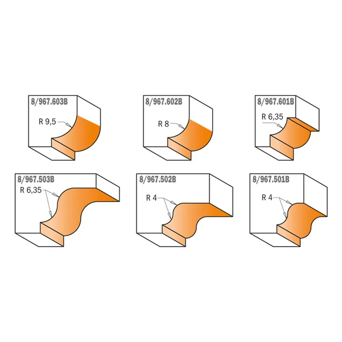 Široká nabídka profilových fréz CMT je určena pro výrobce skříněk a nábytku. Dodáváme 14 různých profilů na hrany stolů, obložení dveří nebo okrasné lišty. Každá profilová fréza může být upravena pro výrobu dvou profilů pouhou výměnou ložiska. Při výměně ložiska zkontrolujte, zda pravá strana černé podložky ložiska odpovídá otáčení ložiska. Nesprávná montáž může způsobit vypadnutí šroubu.