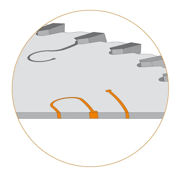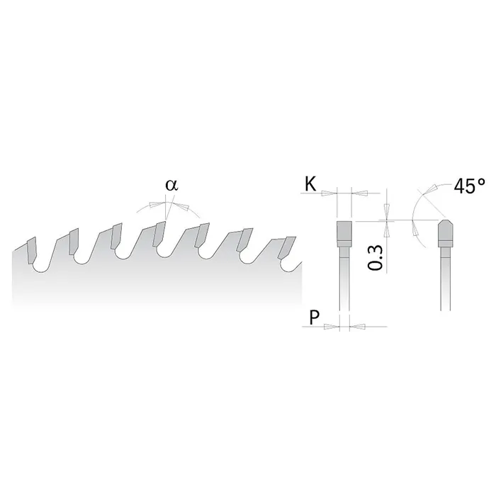 Pilový kotouč pro pily s předřezem. Kotouč s chromovaným povrchem, který redukuje ulpívání zbytků lepidla a pryskyřice na těle kotouče. Trapézové zuby z extra tvrdého tvrdokovu pro řezání lamina, dřevotřískových desek a MDF. Má tlumící drážky vyplněné oranžovým polyuretanem pro snížení vibrací a hlučnosti. Vysoká životnost díky mimořádně tvrdým zubům KCR05+ s tvrdostí HV10:2170.