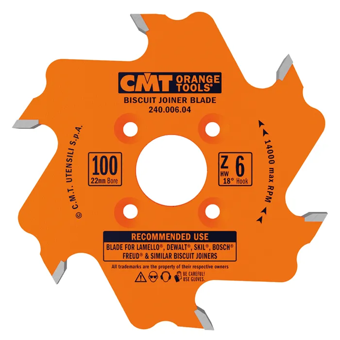 CMT lamelovací kotouč s teflonovým oranžovým povrchem je vyroben z jakostní oceli. Tělo je osazeno tvrdokovovými zuby, které garantují dlouhou životnost. Určeno pro lamelovací frézky. Vhodné pro značky Lamello, Dewalt, Porter-Cable, Skil, Bosch, Freud a další klasické lamelo stroje.