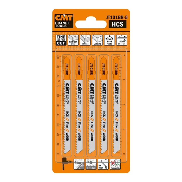 Pro jemné rovné řezy a dokončovací práce na povrchu. Reverzní zub. Materiál: měkké / tvrdé dřevo (3–30 mm), překližka, lamino, plasty.