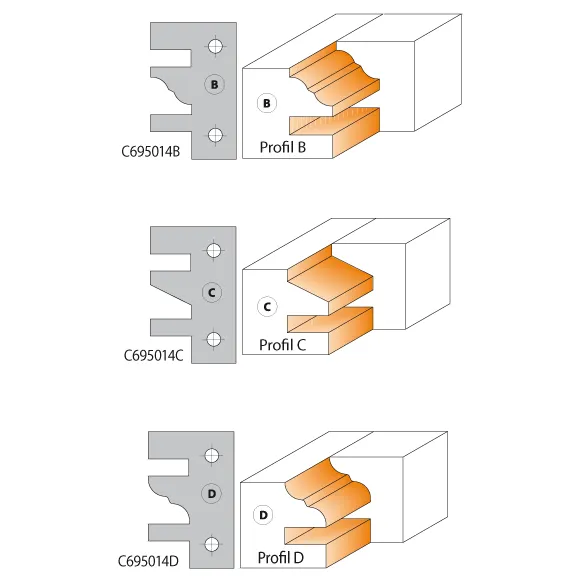 Fréza je vybavena 2 profilovými tvrdokovovými žiletkami. Pouhým vysunutím frézy nad stůl zvolíte, zda budete vyrábět profil, který je vybroušen v dolní části žiletky nebo dílec otočíte a posunete frézu pod stůl tak, aby zabírala horní část žiletky, na které je vybroušen kontra profil. Můžete vyrobit až 4 typy rámečkových profilů. Dodáváno s profilem A. Další profilové žiletky typu B, C a D jsou dodávány jako náhradní díly. Konstruováno pro šířku rámu od 22 do 26 mm. Upínací průměr d = 30, 40 nebo 50 mm.