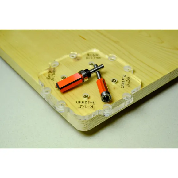 Užitečný třídílný set šablon obsahuje 8mm silné akrylové šablony, které umožňují vytvářet 12 různých poloměrů za pomoci ořezávací nebo drážkovací frézy. Sada obsahuje 4 ustavovací kolíky a 4 šrouby. Kolíky použijte pro umístění šablony na obrobku, dále použijte čtyři šrouby pro její upevnění. Vyjměte ustavovací kolíky a použijte stopkovou frézu pro odfrézování rohu obrobku podle šablony.