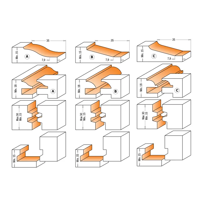 • 3 typy profilů A – B – C. • Tvrdokovové břity HM. • Teflonový nepřilnavý potah. • Precizně naostřené břity. • Provedení proti zpětnému rázu ANTI-KICK. Použití: Pro výrobu výplní dvířek, dveří a zásuvkových čel. Nutno použít frézovací stolek. POZOR: Výkon frézky musí být nejméně 1500W. Doporučujeme naši frézku 1900W, která dosahuje nejlepších výsledků pro výrobu dvířek. Doporučujeme náš frézovací stolek, který byl testován pro toto použití. Ekonomicky výhodná sestava fréz obsahuje 5 kusů fréz – sadu pro rám výplně, výplňovou frézu, frézu pro lepené spoje a frézu na výrobu zásuvek. Za tuto sadu fréz zaplatíte mnohem méně než při zakoupení jednotlivých fréz. Navíc je v ceně dřevěné pouzdro pro bezpečné skladování.