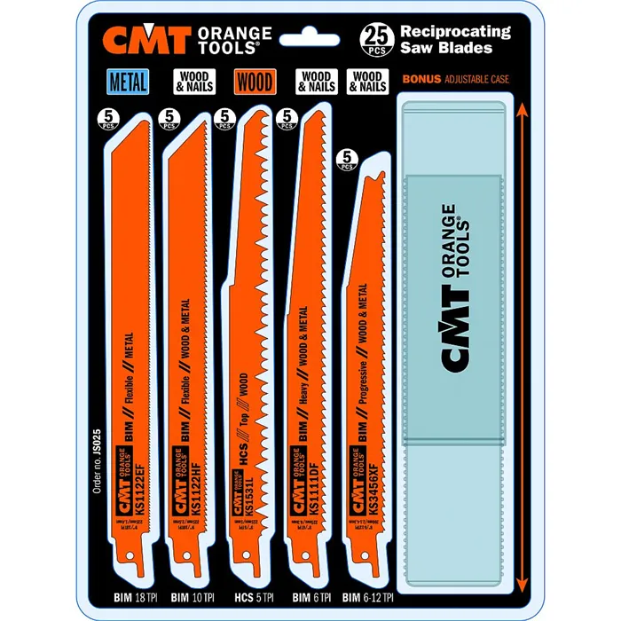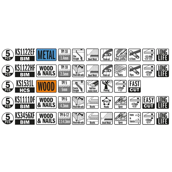 Sada 25 kusů obsahuje 5 nejpopulárnějších pilových listů pro pily ocasky. Sada je složena z pilových listů vhodných pro různé materiály: