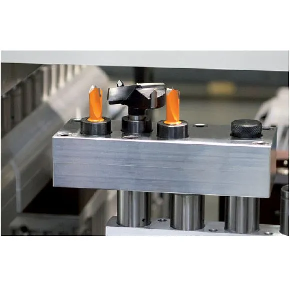 Nová vrtací hlava se třemi vřeteny pro upnutí sukovníku a dvou kolíkovacích vrtáků pro závěsy Blum, Salice, Häfele a Hettich s roztečí 45 / 9,5 mm. Určeno pro upnutí do kolíkovaček a průběžných kolíkovacích strojů.
