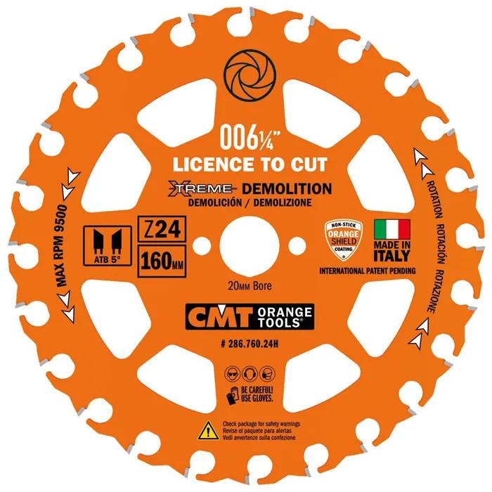 Nejlepší kotouč na demoliční práce, přestavby dřevěných konstrukcí nebo řezání palet.CMT XTreme Pilový kotouč na demoliční práce zvládne až 20x více řezů než konkurenční kotouče. Díky nízké hmotnosti a mimořádně pevné geometrii zubů je tento kotouč vysoce odolný vůči nárazům do kovů ve dřevě, například hřebíků. Můžete tak provádět přesné řezy bez námahy.Řezejte dřevo s hřebíky, ať už pevně zasazenými nebo uvolněnými. Efektivně i v náročných podmínkách!• Použití: Pro demoliční práce, vynikající výkon a vysoká odolnost i v náročných podmínkách.• Stroje: Aku i síťové ponorné a okružní pily. Vhodné i pro stroje Festool.• Materiál: Víceúčelové. Dřevo (s hřebíky), překližka, OSB desky, sádrokarton.NÍZKÁ HMOTNOST KOTOUČEPatentovaný design, který snižuje hmotnost kotouče, minimalizuje přehřívání a zásadně zvyšuje účinnost řezání s aku pilami i pilami do sítě.Více řezání, nižší spotřeba baterie.MIMOŘÁDNĚ PEVNÁ GEOMETRIE ZUBŮLépe odřezává hřebíky.Odřeže více hřebíků než konkurenční kotouče.Navrženo pro nejdelší možnou životnost v těch nejnáročnějších podmínkách.Zuby jsou zasazeny hlouběji do těla kotouče pro vyšší odolnost vůči nárazům do hřebíků.ORANGE SHIELDVýjimečný povlak, který proslavil CMT po celém světě.Tento speciální oranžový povlak zabraňuje ulpívání nečistot na kotouči, chrání před přehříváním a korozí a eliminuje tření. Díky tomu můžete provádět přesné řezy bez námahy.Oranžový povlak se nanáší na vysoce kvalitní ocel, která je díky kalení mimořádně pružná a odolná.