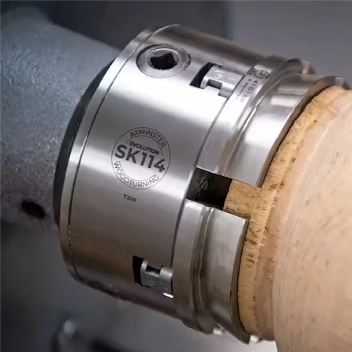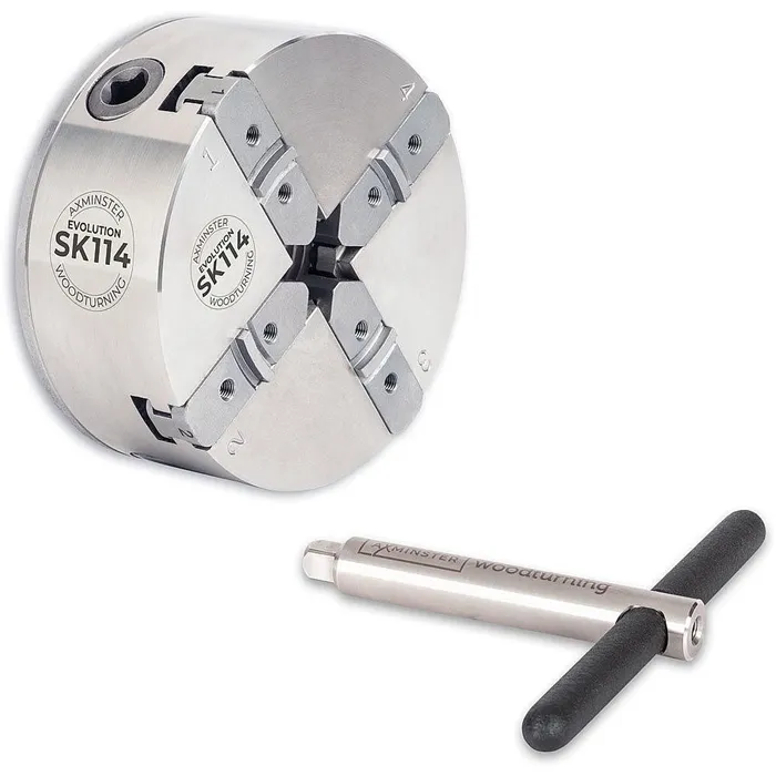 Před více než pětatřiceti lety firma Axminster vyrobila a uvedla na trh jedno z prvních samostředicích čtyřčelisťových sklíčidel pro soustruhy na dřevo. V průběhu let byla řada produktů vyvíjena na základě zpětné vazby a podnětů od profesionálních soustružníků. Díky více než třem desetiletím zkušeností s výrobou a konstrukcí věří společnost Axminster, že tato nejnovější sklíčidla patří mezi ta nejlepší na současném trhu. Výroba sklíčidel Evolution, čelistí i příslušenství probíhá výhradně ve výrobním závodu společnosti Axminster ve Velké Británii.Sklíčidlo Evolution SK114 má mimořádně tenké tělo z nerezové oceli o průměru 114 mm, které je osazené čelistmi SafetyJaw©. Ultrakompaktní konstrukce umožňuje uchytit obrobek co nejblíže k vřetenu soustruhu, čímž se snižuje zatížení ložisek a omezují nežádoucí vibrace při odebírání většího množství materiálu. Delší čelisti pro uchycení příslušenství zvětšují kontaktní plochu v kluzných drahách sklíčidla, což dále snižuje vibrace při použití. Sklíčidlo Evolution je plně kompatibilní se všemi čelistmi. Stačí zvolit správný závit pro váš soustruh.Vyrobeno výhradně v Axminsteru ve Velké Británii.Dodáváno s ergonomickou kličkou sklíčidla.Poznámka: Sklíčidlo se závitem M33 × 3,5 mm je vhodné pro standardní závity M33 × 3,5 mm a pro soustruhy s vřetenem ASR (Euro standard) určené pro otáčení na protisměrné otáčky soustruhu. Má v těle vyfrézovanou drážku ASR, kterou lze použít spolu s ASR zamykacím kroužkem (není součástí). Zamykací kroužek zabrání uvolnění sklíčidla při protisměrném chodu. Pro protisměrný chod je třeba mít soustruh se standardním evropským vřetenem M33 × 3,5 mm (ASR).Pro zajištění úplné kompatibility upínacích čelistí pro sklíčidlo SK114 doporučujeme namontovat kluzné kameny.