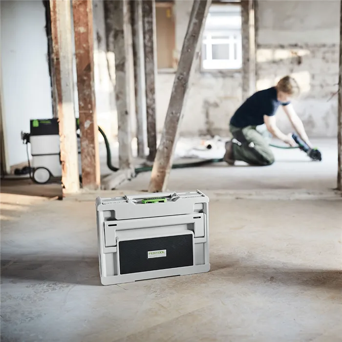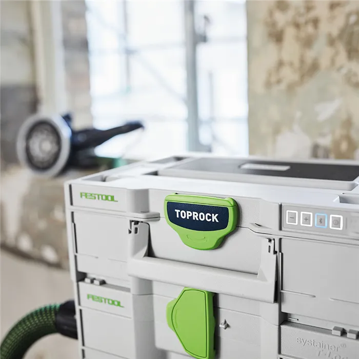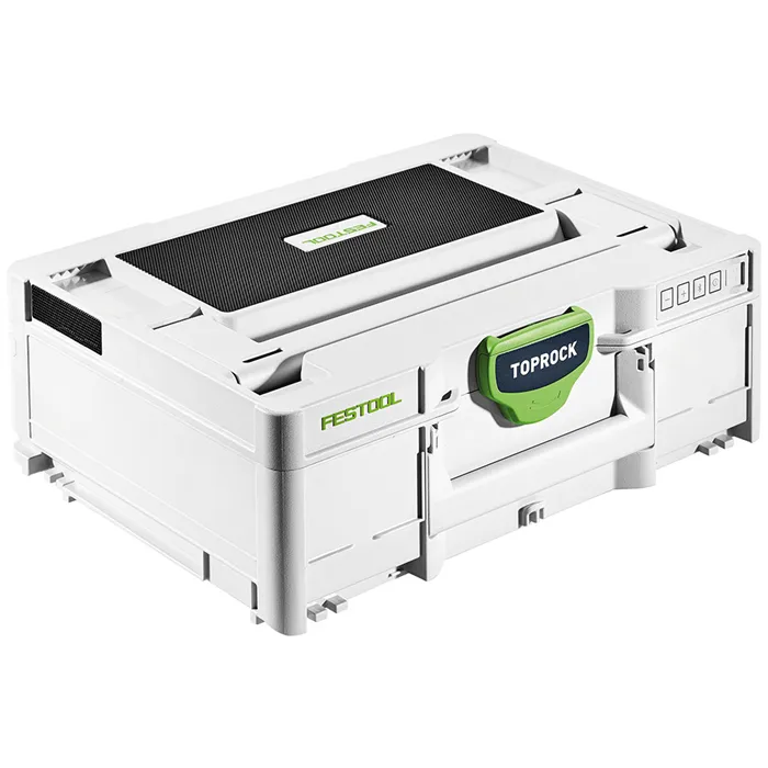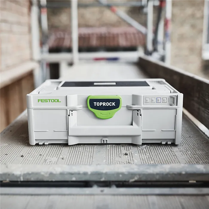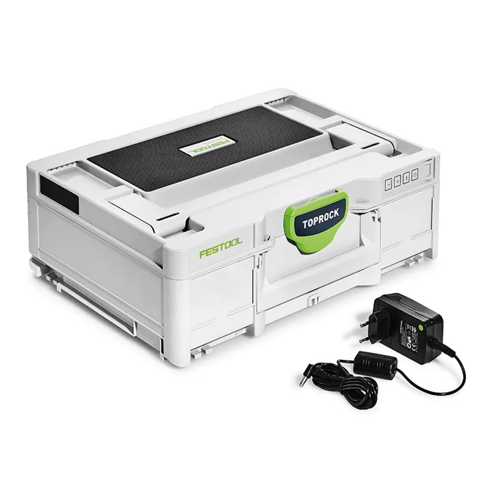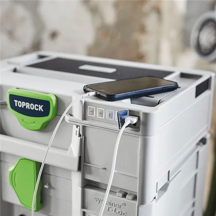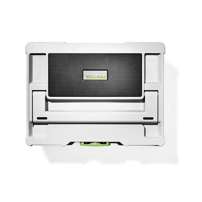 Zvuk Systaineru.Nový člen kapely Festool se jmenuje TOPROCK. Reproduktor Bluetooth® ve víku Systaineru³ spojuje výhody systému Systainerů Festool s vynikajícím zvukem. Čtyři vysoce výkonné reproduktory zabezpečují v kombinaci s důmyslně tvarovanou rezonanční komorou jasný a plný zvuk. Chcete ještě víc? V tom případě jednoduše spojte dva reproduktory TOPROCK se svým chytrým telefonem a užívejte si prostorového stereozvuku.