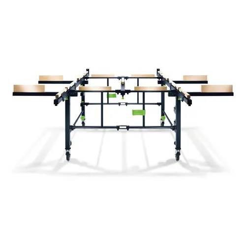 Dobře naložený.Dřevěné opěrky vždy optimálně podepírají deskový materiál a obrobky a umožňují přesné obrábění. Bez problémů lze pouze v jedné osobě snadno umístit i desky o velikosti až 3.100 × 2.150 mm a ty také v jedné osobě přesně obrábět. A pro ještě pohodlnější práci je stůl podle požadované pracovní výšky výškově nastavitelný až do 90 cm a s ruční okružní pilou a vodicí lištou se promění v mobilní pilu na dělení desek.
