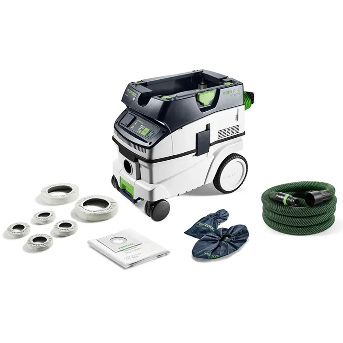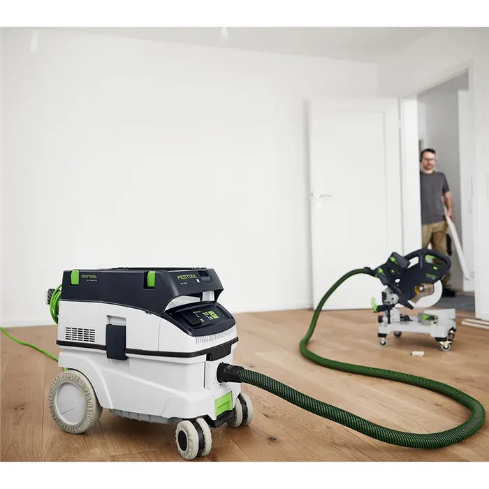 CTL 26 EI-FLR je ideální pomocník pro práci na choulostivých podlahách. Díky návlekům na kolečka, návlekům na boty a PUR kabelu bez otěru nezanechá na podlaze žádné stopy. Dotykové ovládání zajišťuje intuitivní obsluhu, pevně nainstalované rozhraní Bluetooth® umožňuje automatické spuštění vysavače přes akumulátorové nářadí Festool nebo volitelné dálkové ovládání. Kompaktní, mobilní a výkonný – středobod vašeho systému.