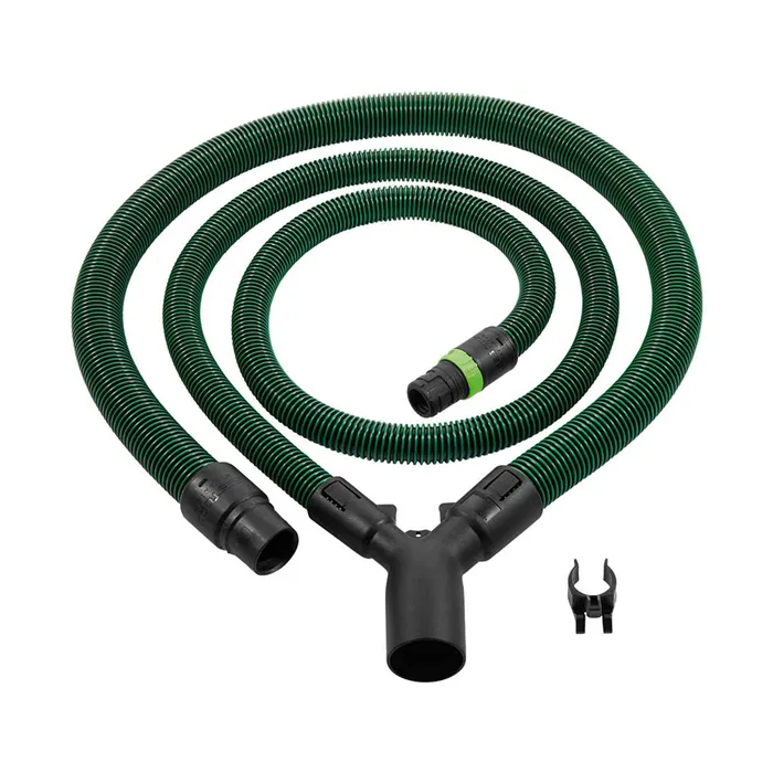 Když prach odchází na dvou místech, jedna odsávací hadice nestačí. U spodních kapovacích pil CS 50, CS 70 nebo také stolní okružní pily TKS 80 pomůže odsávací sada, která zachycuje prach tam, kde vzniká: jak u ochranného krytu, tak také u samotného nářadí. Kombinace dvou hadic – s průměrem D 27 a D 36 – je perfektně uzpůsobená pro tato nářadí a pomocí rozdvojky Y spojuje obě místa, kde odchází prach, s mobilním vysavačem. Antistatická funkce navíc brání nabíjení statickým nábojem. Budete tak pracovat zdravě, bezprašně a pohodlně.