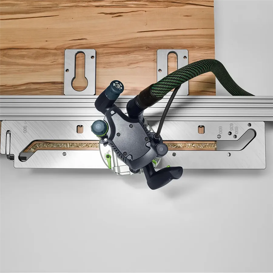 - Dodatečně se dvěma volně polohovatelnými frézovacími šablonami pro zapuštění běžného spojovacího kování na dolní straně desky