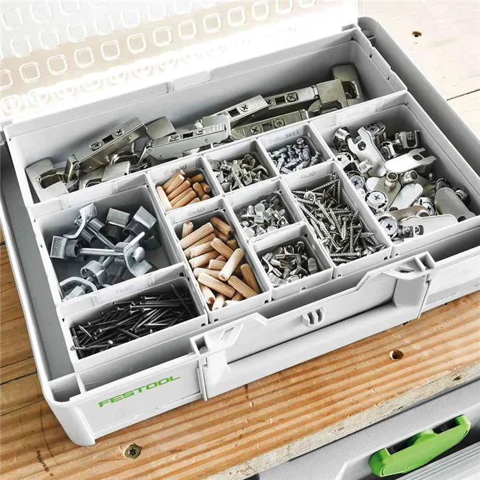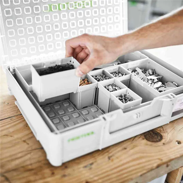 Bezpečné a přehledné – drobné díly, jako hřebíky, hmoždinky, šrouby, bity, vrtáky nebo pilové plátky, jsou uspořádané, po ruce a na svém místě. Díky průhlednému víku organizéru ihned vidíte, které díly jsou uvnitř. Díky vkládacím boxům o různých velikostech lze organizér uzpůsobit podle individuálních potřeb.