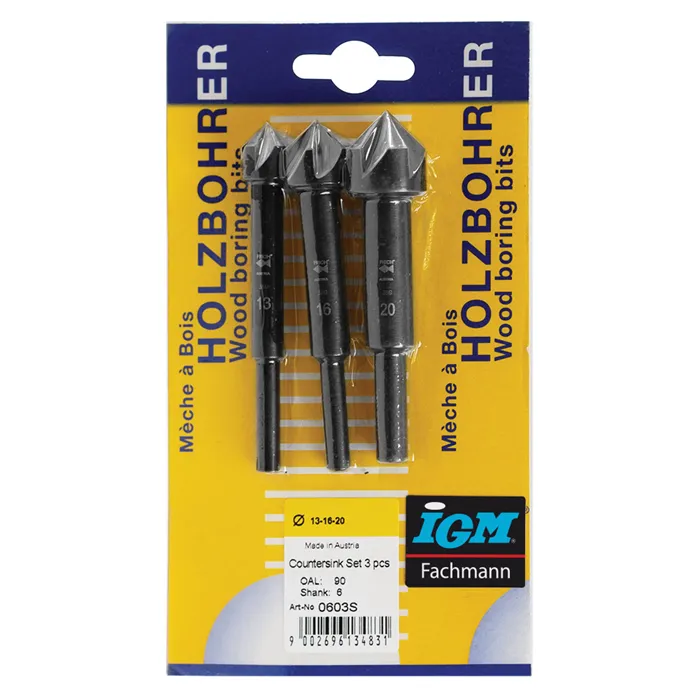 Sada 3 ks záhlubníků D13, D16, D20 se zúženou válcovou stopkou. Jsou vhodné pro běžné zahlubování a odstraňování otřepů vrtů v měkkém i tvrdém dřevě, dýhovaných deskách nebo plastech.• Úhel zahloubení: 90°• Celková délka: 90 mm• Délka stopky: 30 mm• Doporučené otáčky: 1500-2500 ot./min.Baleno v papírovém blistru.