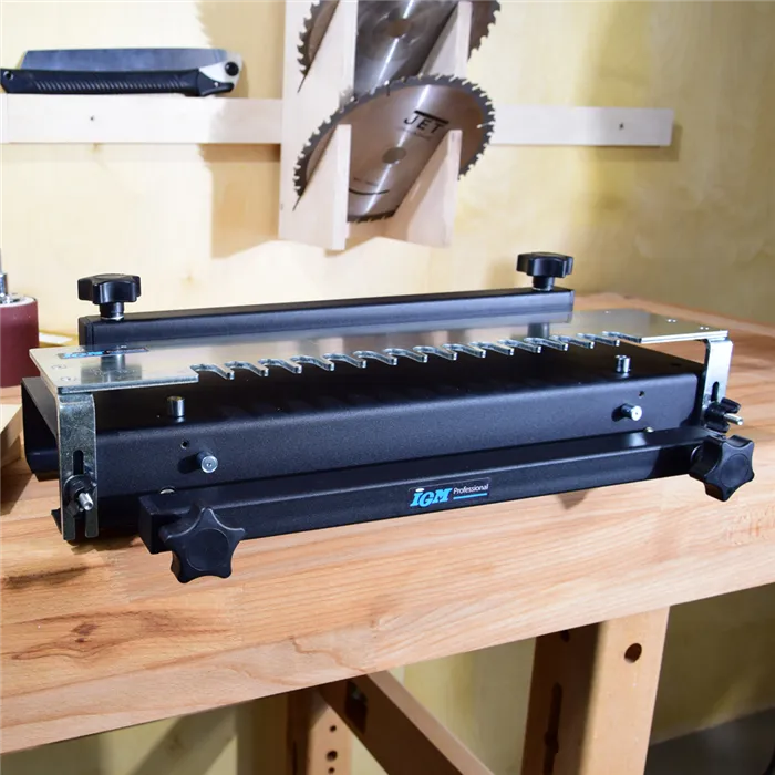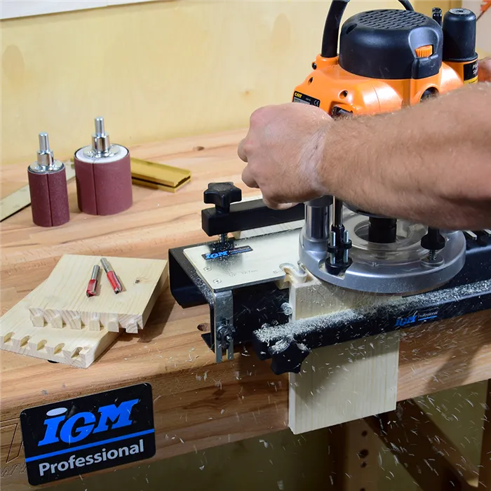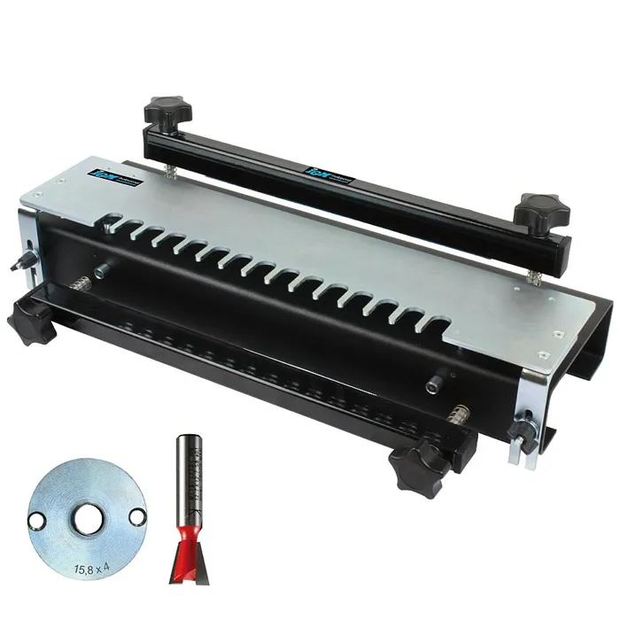 • Dvě velikosti přípravku.• Pevné ocelové tělo.• Přesná laserem řezaná šablona z 4mm pozinkovaného ocelového plechu.• Masivní držáky šablony.• Robustní ocelové přítlaky.• Jednoduché nastavení a používání.• Šablony pro minirybinu, čepový spoj a otevřenou rybinu jsou k dispozici jako příslušenství.• Speciální úchytné otvory pro umístění dorazů na šabloně.IGM cinkovací přípravek je určen pro výrobu polokrytých rybinových spojů pomocí ruční frézky a stopkové frézy. Polokryté rybinové spoje se nejčastěji používají na zásuvkách z masivního dřeva. Díky volitelným šablonám lze přípravek rozšířit na výrobu různý typů spojů, jako jsou čepové spoje, otevřené rybinové spoje, které využijete pro výrobu nábytku z masivního dřeva, šperkovnice nebo pracovní bedny z masivního dřeva. Robustní přítlaky bezpečně upnou i větší dílce. Jednoduše obrobek upevníte na tělo přípravku, upnete zvolenou šablonu, nastavíte hloubku frézování a pomocí kopírovacího kroužku upnutého v ruční frézce vyfrézujete zvolený spoj. Cinkovací přípravek je vyroben v České Republice.Parametry:• Průměr kopírovacího kroužku: 15,8 x 4mm• Max. průměr základny frézky: 180mm• Velikost spoje: 12,7mm 14°• Tloušťka obrobku: 11 - 25mm• Šířka obrobku: 305mmSoučást balení:• Kompletní cinkovací zařízení• 12,7mm šablonu pro polokrytý rybinový spoj• Kopírovací kroužek D15,8 4mm• HM Rybinovou frézu D12,7 x 12,7/14° stopka 8mm• Jasný a přehledný návod k obsluzeDo některých typů horních frézek není možné přímo upnout IGM kopírovací kroužek. Pomocí průhledné redukční desky FRB170, kterou připevníte na základnu Vaší horní frézky, přesně vycentrujete a upnete IGM kopírovací kroužky.