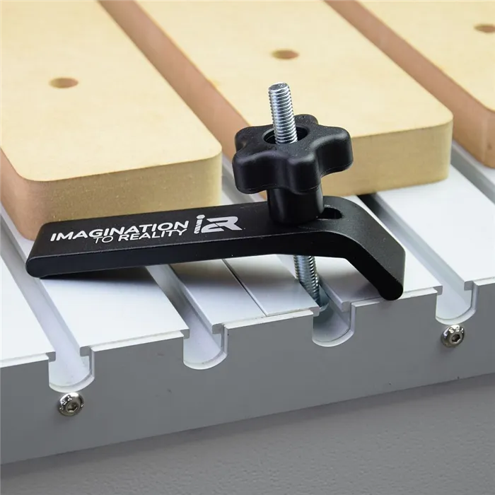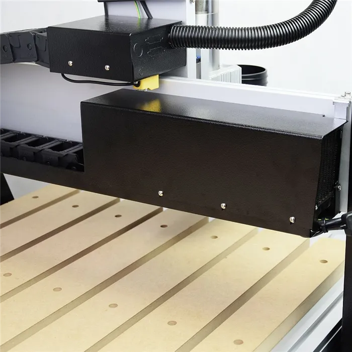 • Přesný a rovný hliníkový stůl s T drážkami a MDF deskami.