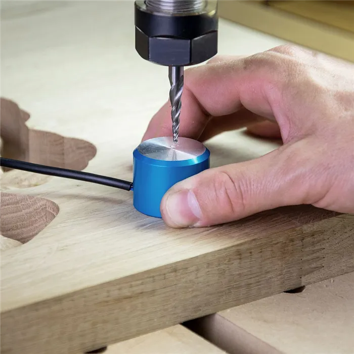 Součástí stroje je dotykový senzor výšky nástroje. Jakmile do vřetena vložíte nový nástroj, je třeba přesně změřit délku vašeho nástroje vzhledem k dílci nebo pracovnímu stolu. Dotykový senzor snadno zapojíte do konektoru na portálu frézky, senzor pak položíte pod nástroj a prostřednictvím programu UCCNC a jeho funkce AUTO Touch-Off se délka nástroje automaticky změří a uloží do programu UCCNC.