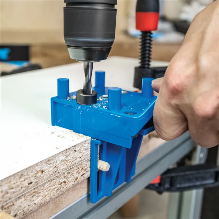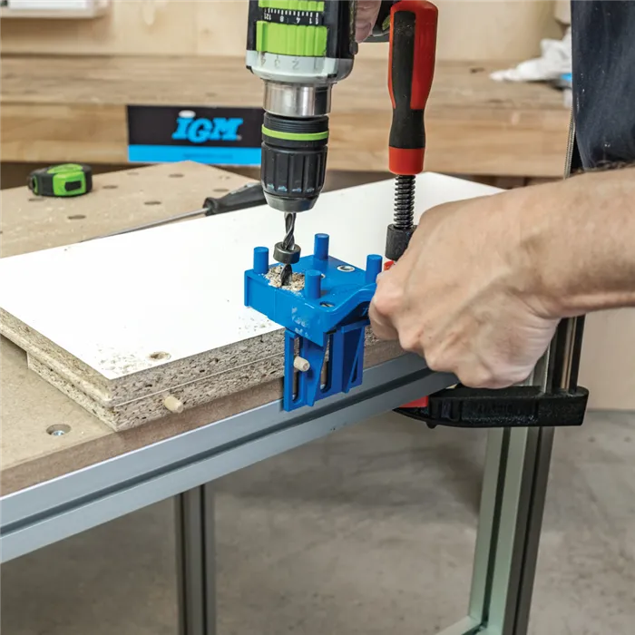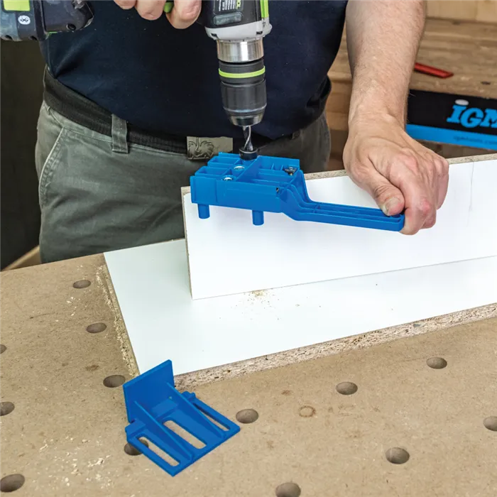 IGM základní kolíkovací přípravek je díky svému snadnému použití určen převážně pro kutily. S přípravkem spojíte dílce do tvaru E, L a T na kolíky o velikosti 6, 8 nebo 10mm. Centrovací trny přípravku vystředí otvor až na 30mm tlustém dílci. Madlo přípravku umožňuje snadnou manipulaci a přidržení při vrtání. Přípravek přidržíte na dílci, umístíte vrták do kaleného ocelového pouzdra přípravku a vyvrtáte požadovaný otvor na dílci. Pro usnadnění práce můžete použít sadu značících hrotů a hloubkový doraz na vrtáku. Jednou z výhod oproti jiným vrtacím přípravků je to, že již nebudete mít s vystředěním otvoru žádnou práci.