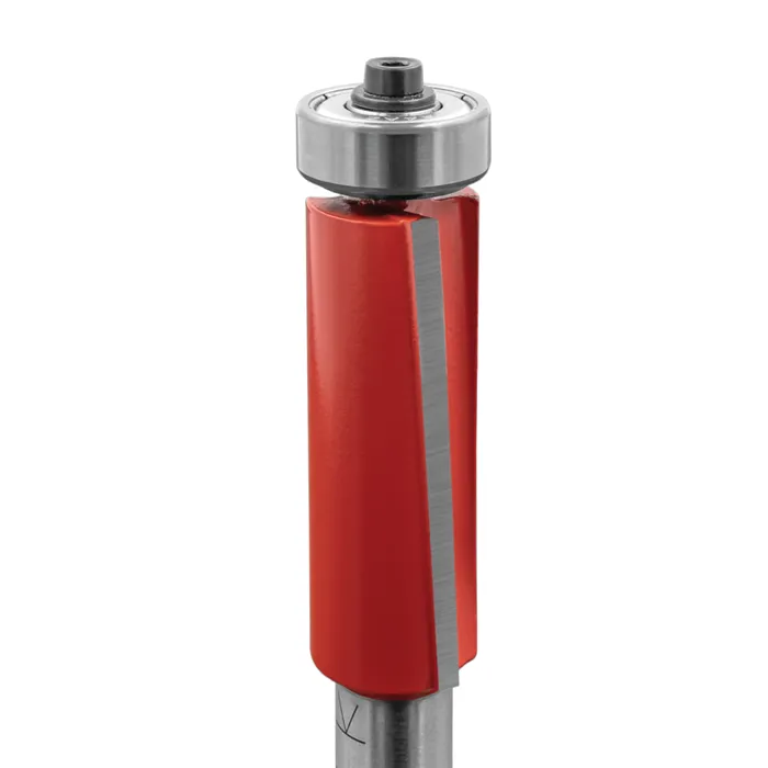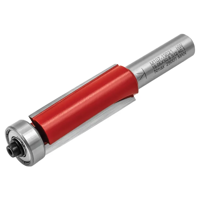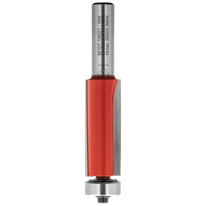 Ořezávací fréza M107 se dvěma šikmými zuby z tvrdokovu a kopírovacím ložiskem je určená pro ořezávání podél šablony upevněné pod obráběným materiálem, zejména pro frézování zakřivených tvarů. Lze použít pouze v ručních frézkách.