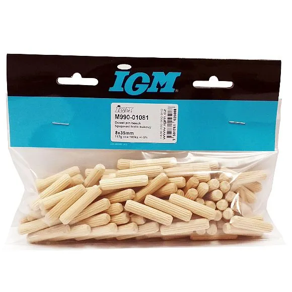 Dřevené kolíky jsou vyrobené z tříděného bukového dřeva, kdy vlhkost dřeva se pohybuje od 8% - 11%.Ruční třídění spojovacích kolíků garantuje to, aby naši zákazníci dostali pouze kvalitní kolíky.Určeno pro spojování nábytkových dílců z velkoplošných materiálů nebo masivního dřeva.