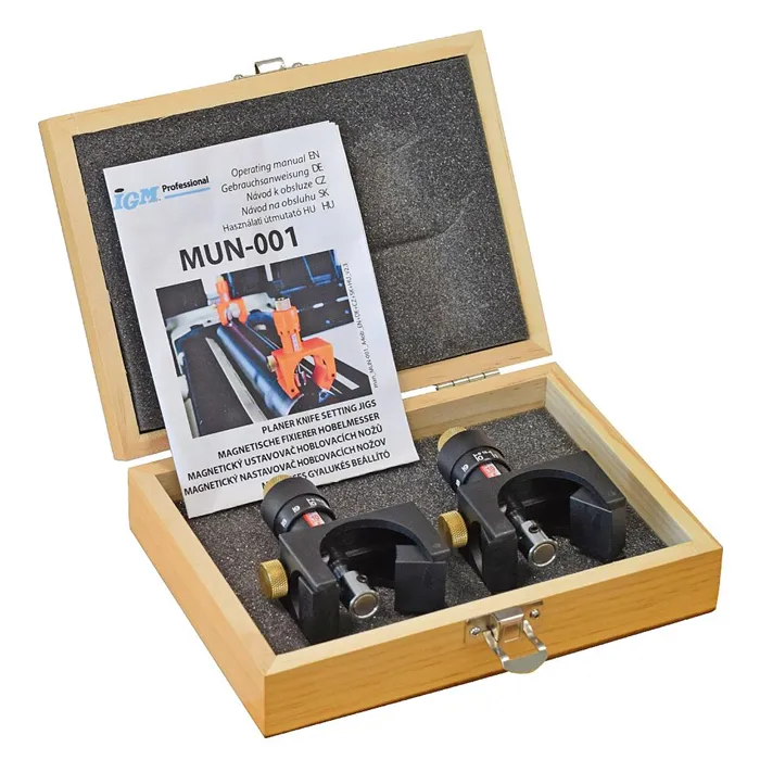 Sada 2 ks magnetického ustavovače hoblovacích nožů garantuje přesné ustavení nožů v hoblovacím válci Vašeho stroje – tlouštkovací nebo srovnávací frézky.Ustavovač je vybaven mikrometrickou ryskou pro přesné a rovnoměrné nastavení hloubky úběru třísky po celé délce válce.