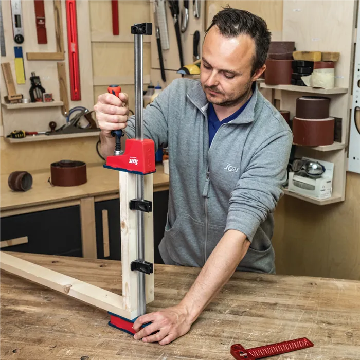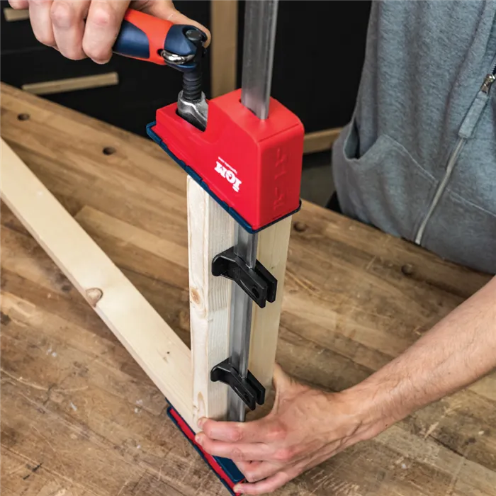 Čelisti z uhlíkové oceli jsou hluboké 90 mm, udržují konstantní úhel 90° i při zatížení a rovnoměrně roznáší tlak po celé upínací ploše. Čelisti jsou osazené plastovými kryty s velkou upínací plochou o šířce 47 mm, které je chrání proti lepidlu stékajícímu z lepeného dílce a které zároveň zabraňují poškození stahovaného materiálu. Odnímatelná spodní čelist umožňuje svěrku přeměnit na rozpěrku. Patentovaný protiskluzový posuv čelisti po tyči zajišťuje pevné zafixování v potřebné poloze.Abyste mohli korpusy lepit pohodlně i na pracovním stole, je svěrka vybavena třemi podpěrami na vodicí tyči, které ji drží stabilně na pracovní ploše. Mezi čelistmi se nachází dvě podpěry se zaoblenými rohy, které zabraňují poškození materiálu. Podpěra na konci vodicí tyče slouží jako zarážka čelistí, při přeměně na rozpěrku ji lze jednoduše odejmout.