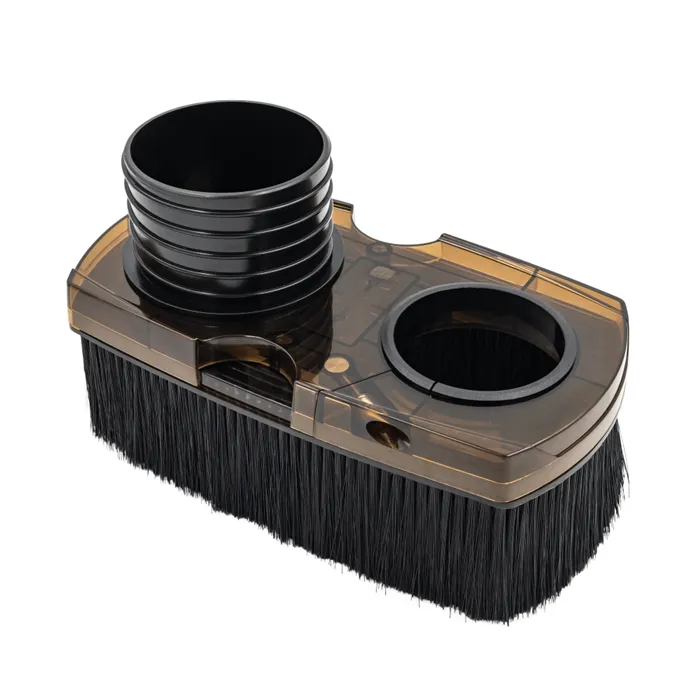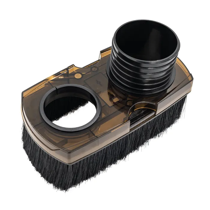 Kryt, na který lze připojit 100 mm odsávací hadice, pomáhá po připojení odsavače efektivně odsávat prach přímo při frézování. Pracovní plocha tak zůstává téměř bez prachu. Kryt s pevnými štětinami je osazený magnety a lze jednoduše vyjmout pro přístup k vřetenu.