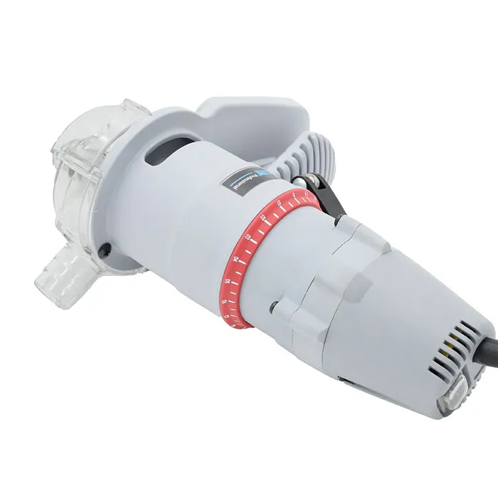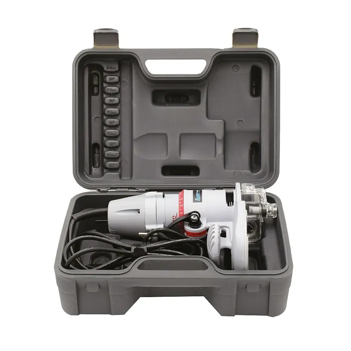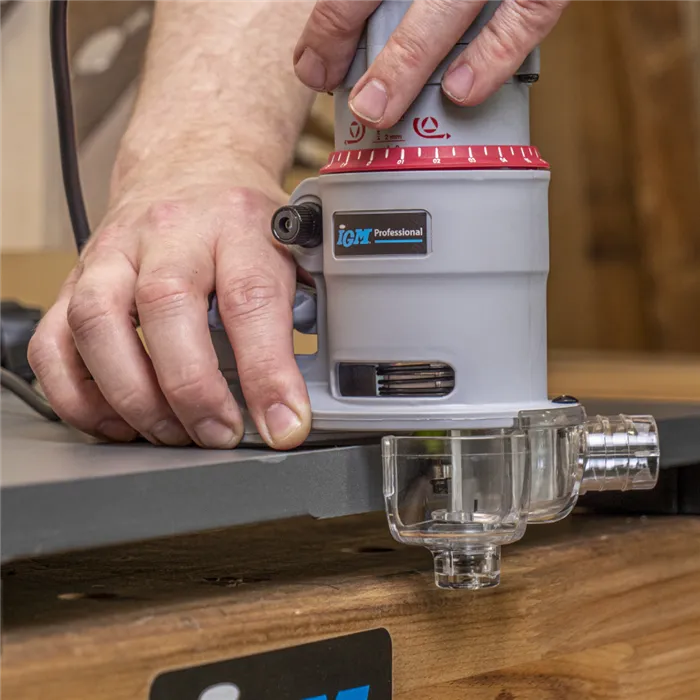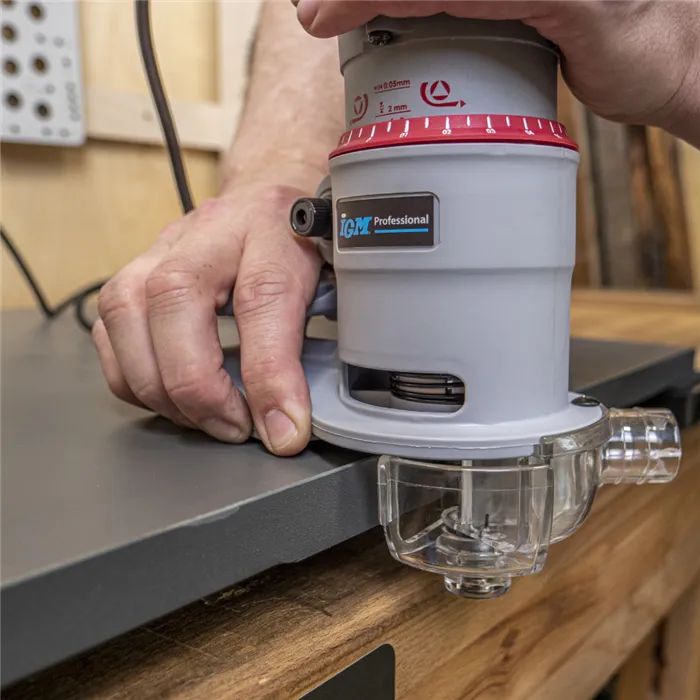 • Efektivní ohraňování a ořezávání hran pod radiusem nebo úhlem.• Nastavení hloubky frézování otočným mechanismem se stupnicí.• Mikrostupnice 0,05 mm pro přesné nastavení hloubky frézování.• Průhledný otočný kryt s integrovanou odsávací hubicí.• Přibržďování kopírovacího ložiska proti poškození dílce.• Dodáváno s tvrdokovovou radiusovou frézou R2mm.• Vestavěná cidlina pro srážení ostrých hran.• Možnost upnutí v IGM olepovacím stolku.• Jemné a přesné nastavení hloubky frézování.• Vyvýšené opěrné plochy přes ABS hranu.• Brzda ložiska.• Baleno v přepravním plastovém kufru.PD80 ořezávací a ohraňovací frézka je určena pro precizní zaoblení nebo zkosení nábytkových hran z PVC, ABS nebo dýhy a všech hran dřevěných nebo plastových dílů či desek.Jedinečná konstrukce frézky dává vynikající stabilitu díky vodící základně s madlem. Motor má 30000 ot./min a poskytuje dostatečnou sílu i pro větší úběry materiálu. Je vybavena unikátním průhledným otočným krytem, který kopíruje povrch a díky kterému vždy perfektně vidíte na práci. Integrovaná odsávací hubice umožňuje připojit frézku k odsávání. Ve spodní části krytu je umístěno přibržďování kopírovacího ložiska. Tím se eliminuje poškrábání nebo otlačení dílce od roztočeného ložiska. Přesná hloubka se jednoduše nastavuje otáčením základny, přičemž 1 otáčka je 2 mm a přesné nastavení lze odečítat na stupnici s noniusem s rozlišením 0,05 mm.• Typ: PD80• Doporučené použití: Řemeslník• Příkon: 450 W• Volnoběžné otáčky: 30000 ot./min• Max. zdvih 16 mm• Kleštiny v balení: 6 mm• Délka x šířka x výška: 240 x 90 x 205 mm• Hmotnost: 2,3 kgSoučást balení:• Zaoblovací radiusová fréza R2mm• Montážní klíče• Plastový přepravní kufr.