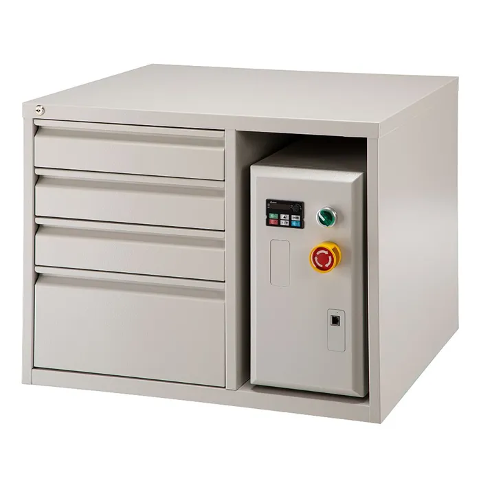 Pořádek a bezpečnost je nedílnou součástí práce s CNC frézkou. Ve skříňce na nářadí bezpečně uložíte ovládací box a veškeré příslušenství jako jsou svěrky, nástroje, kleštiny nebo dotykový senzor v jednom ze čtyř šuplíků.