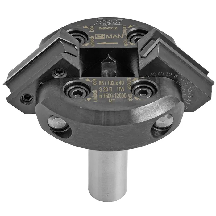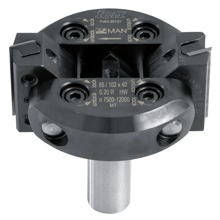Technické údaje:Ocelové tělo nástroje, dvě otočné žiletky na nastavitelných nosičích. Rozsah úhlu otočení je směrem nahoru 0-45° a dolů 0-90°, nekonečné množství různých nastavení na přesné stupnici. Pro jednoduché nastavení jsou každých 7,5° přednastavené zarážky. Pro výměnu žiletek není třeba měnit nastavený úhel. Pravotočivé provedení.Použití:• Vhodné pro truhlářské práce, falcování a zkosení hran na masivu nebo prknech.• Pro CNC obráběcí centra s mechanickým posuvem.