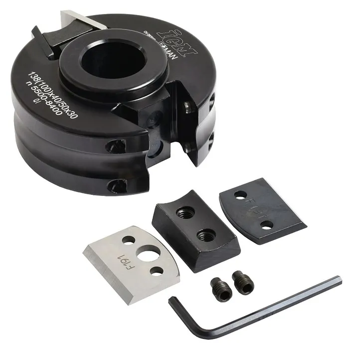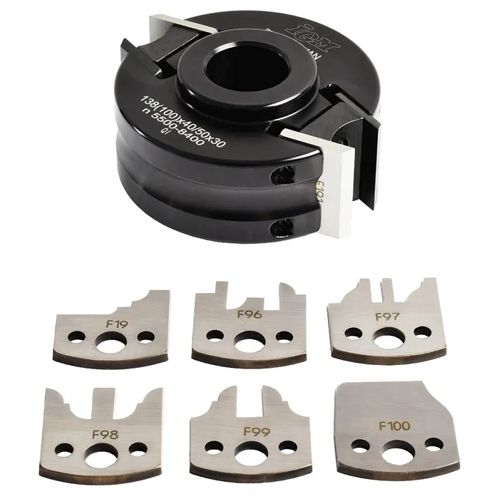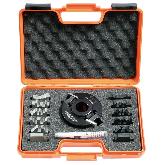 Velmi oblíbená sada univerzální frézovací hlavy a profilů pro výrobu dvířek a výplní z měkkého dřeva. Tělo nástroje je vyrobeno z kvalitní oceli nebo z tvrzené hliníkové slitiny (ALU) s vysokou pevností. Euro upínací systém zajišťuje perfektní a přesné upnutí nožů 40 x 4mm a 50 x 4mm kód F026 a omezovačů F027. Určeno pro ruční posuv MAN.Sada obsahuje: • Univerzální bezpečnostní frézovací hlavu.• 7 párů profilových žiletek a omezovačů 40x4mm.• Vše je dodáváno v luxusním plastovém kufru pro bezpečné uložení nástrojů.Parametry: Otáčky pro D136mm 5800–9000 ot./min., pro D156mm 5100–7400 ot./min., ruční posuv materiálu MAN.
