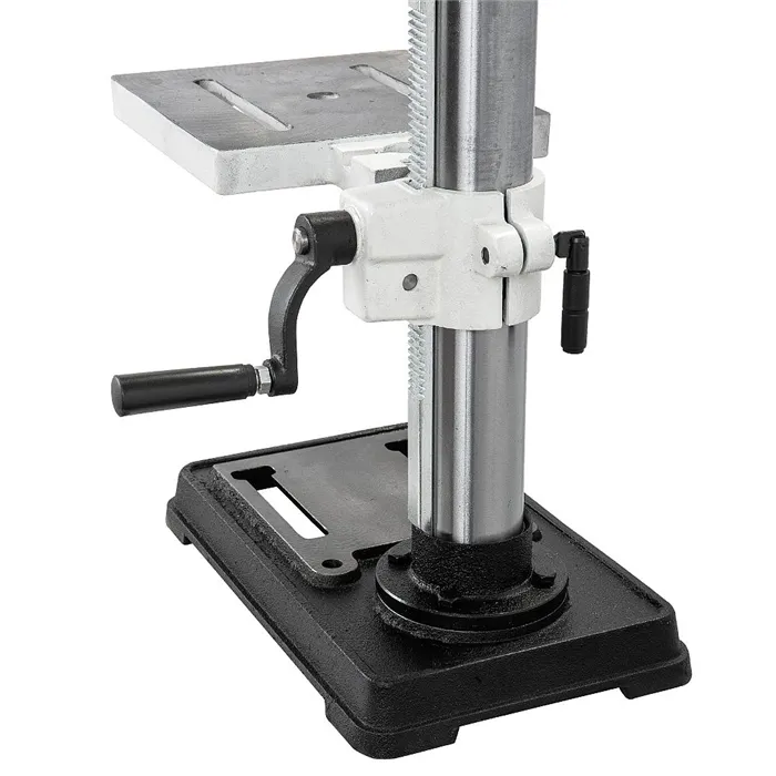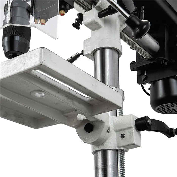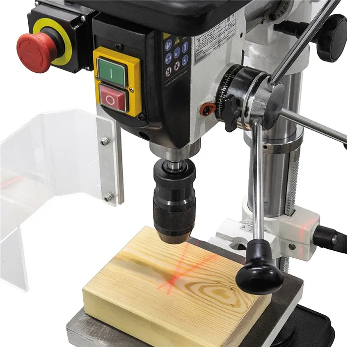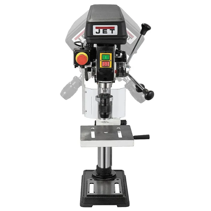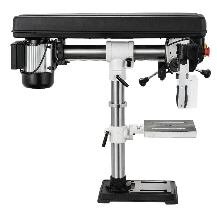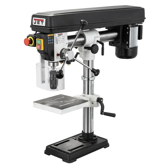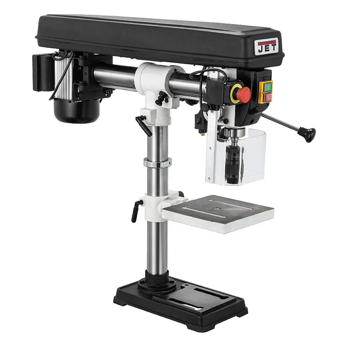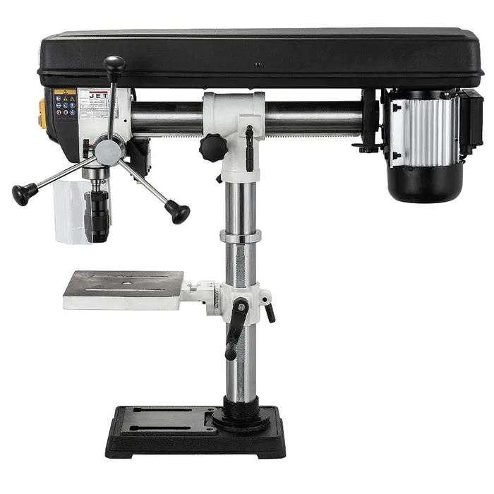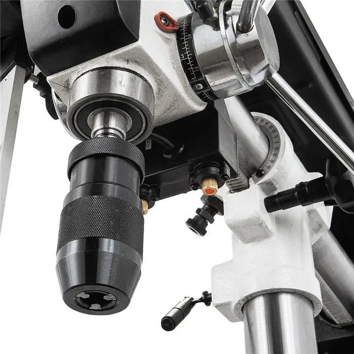 • Indukční 600W motor pro dlouhodobý chod.• Litinový stůl s naklápěním +/- 90 °.• Naklápěcí vrtací hlava.• Ocelový sloup průměru 62 mm.• Rychloupínací sklíčidlo s ochrannou vrstvou 1–16 mm.• Odklápěcí bezpečnostní štít proti odlétajícím třískám.• Maximální kapacita vrtání 410 mm.• Laserový kříž ukazuje bod vrtání.Radiální stolní vrtačka JET JDR-34 má výkonný indukční motor o příkonu 600 W určený pro dlouhodobý chod stroje. Vrtací vřeteno se zdvihem 80 mm je poháněné řemenem s možností volby 5-ti stupňů otáček od 500 do 2500 ot./min. Je vybaveno rychloupínacím sklíčidlem s ochrannou vrstvou s kapacitou 1–16 mm. Má průhledný otočný bezpečnostní kryt proti odlétajícím třískám s bezpečnostním odpojením proudu při výměně nástrojů. Sloup vrtačky je z masivní oceli průměru 62 mm. Litinový stůl má rozměr 220 x 220 mm a lze jej naklopit na obě strany až do svislé polohy tzn. +/- 90 °. Maximální kapacita vrtání je 410 mm (652 mm je od stolu k čelu sklíčidla). Vrtací hlava je sklopitelná v rozsahu -43 ° / +45 °. Stroj je vybaven laserem, který ukazuje laserový kříž bodu vrtání.• Typ: JDR-34• Doporučené použití: Profesionální výroba• Příkon / Výkon (230 V): 600 / 350 W• Otáčky vřetena: 500–2500 ot./min.• Rychlosti: 5• Vzdálenost vřetene od sloupu: 155–410 mm• Max. zdvih: 80 mm• Velikost stolu: 220 x 220 mm• Rychloupínací sklíčidlo: 1–16 mm• Uchycení vřetene: MK-2• Průměr sloupu: 62 mm• Délka x šířka x výška: 830 x 320 x 760 mm• Hmotnost: 42 kg