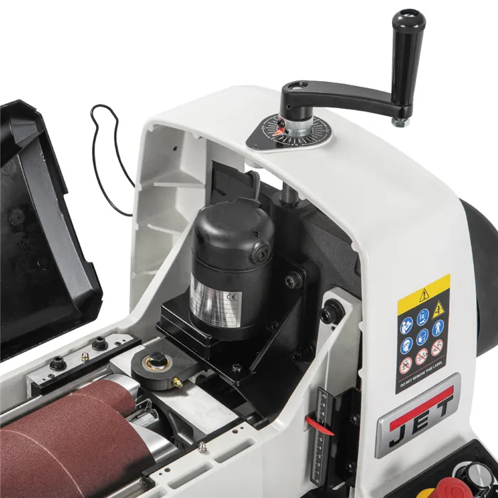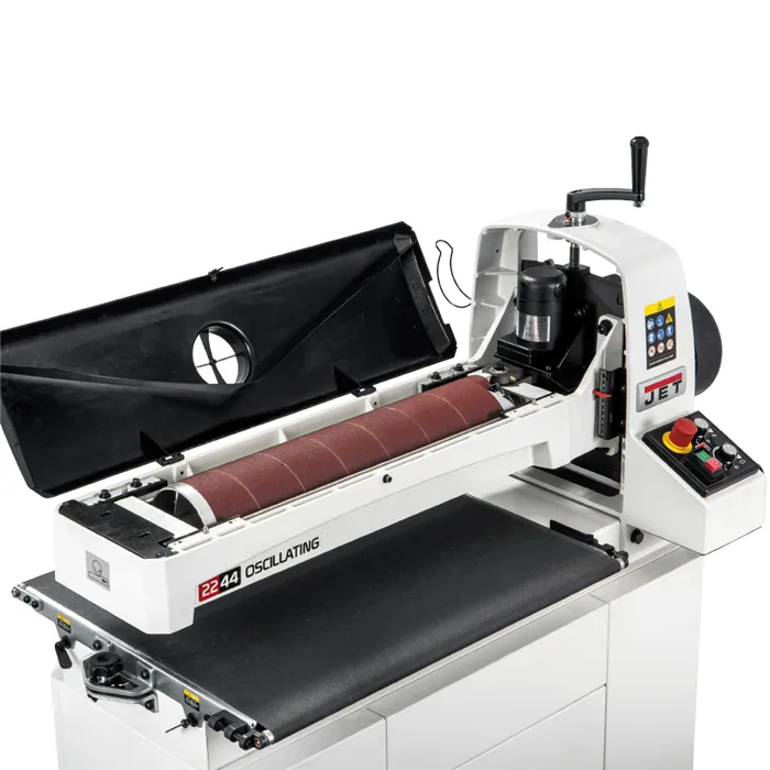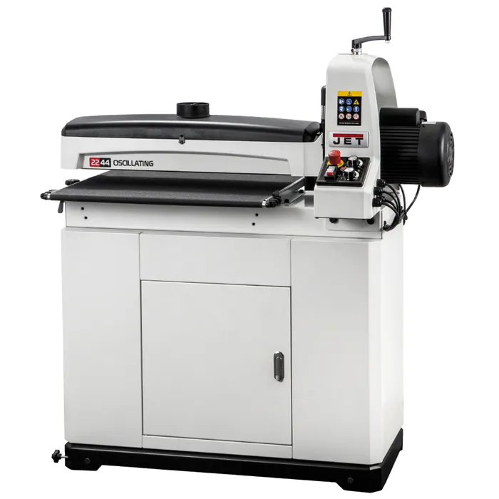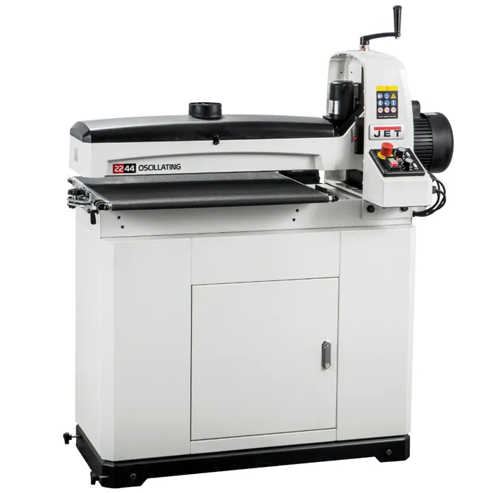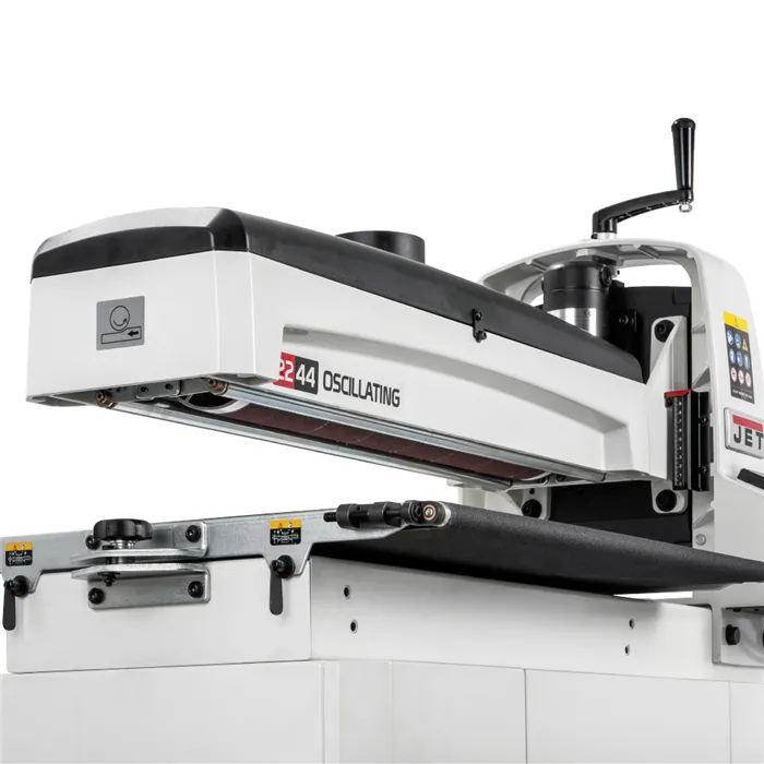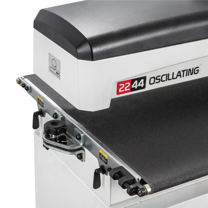 • Unikátní technologie posuvu Sandsmart™ automaticky reguluje posuv.• Elektronická regulace rychlosti posuvu 0 – 3 m/min.• Litinová konstrukce a zavěšení agregátu.• Přesně obrobený a dynamicky vyvážený válec.• Snadná výměna brusného pásu.• Mobilní robustní podstavec s úložným prostorem v základní výbavě.• Nový design odsávacího krytu pro účinnější odsávání.Jedná se o nový model největší oscilační válcové brusky určené pro hrubé a jemné broušení a další dokončovací práce. Při využití dvou průchodů obrousí materiál až o šířce 1120 mm. Maximální tloušťka dílce, kterou je možné brousit, je až 102 mm. Brusný válec je perfektně vyvážený, což snižuje vibrace na minimum. Oscilační pohyb válce zaručuje hladký povrch broušeného materiálu a prodlužuje životnost brusných pásů. Výhodou je plynulá regulace rychlosti posuvu od 0 do 3 m/min. Vhodným nastavením rychlosti posuvu je možné dosáhnout vynikajícího povrchu i na tvrdém dřevě.Stroj je vybaven unikátní technologií Sandsmart™, která umožňuje automatické snížení rychlosti posuvu při přetížení. Přepracovaný systém posuvu táhne obrobek skrz brusku namísto tlačení. Díky nastavitelným přítlačným válečkům, které tlačí obrobek dolů, bruska nepodbrušuje přední a zadní hranu obrobku. Prachový kryt kopíruje tvar válce, čímž umožní účinnější odsávání prachu. Výměna brusného pásu je bez použití nářadí snadná a rychlá, díky vlastnímu napínacímu mechanismu, který je zabudovaný do brusného válce. Vodítka TRACKERS™ značně snižují potřebu ručního seřizování podávacího pásu. Bruska má praktický držák odsávací hadice, což zaručuje, že hadice nepřekáží při práci.Dodáváno s mobilním podstavcem, brusným pásem zrnitosti 80 a podávacím pásem.• Typ: 22-44OSC• Doporučené použití: Profesionální výroba• Výkon (230 V): 1,3 kW, indukční motor• Otáčky: 1400 ot./min.• Průměr válce: 127 mm• Rychlost posuvu: 0–3 m/min.• Tloušťka dílce min. / max.: 0,8–102 mm• Min. délka dílce: 60 mm• Max. šířka dílce: 560 (1120) mm• Šířka brusného pásu: 76 mm• Oscilace: 0-120/min., 19 mm• Odsávání: 100 mm• Délka x šířka x výška: 1200 x 610 x 1320 mm• Hmotnost: 98 kg (+38 kg podstavec)• Rozměry balení - stroj: 1320 x 750 x 700 mm• Hmotnost balení - stroj: 132 kg• Rozměry balení - podstavec: 1030 x 750 x 500 mm• Hmotnost balení - podstavec: 41 kg