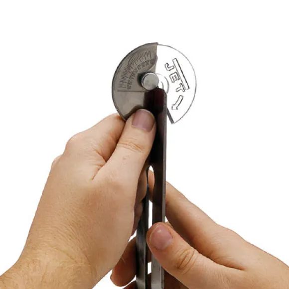 Tento malý nástroj se používá buď k měření stávajícího úhlu zkosení nebo ke kontrole při opakovaném broušení. Pomocí měrky nastavíte vždy stejný úhel. Osvědčí-li se určitý úhel pro konkrétní situaci, může být přesně změřen a pomocí přípravku pro nastavení úhlu broušení vytvořen na brusce. Tato položka je standardně dodávána s novým strojem.