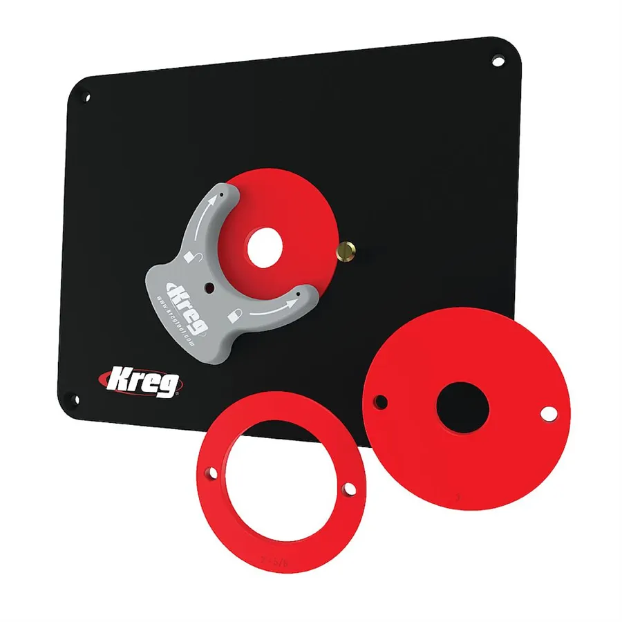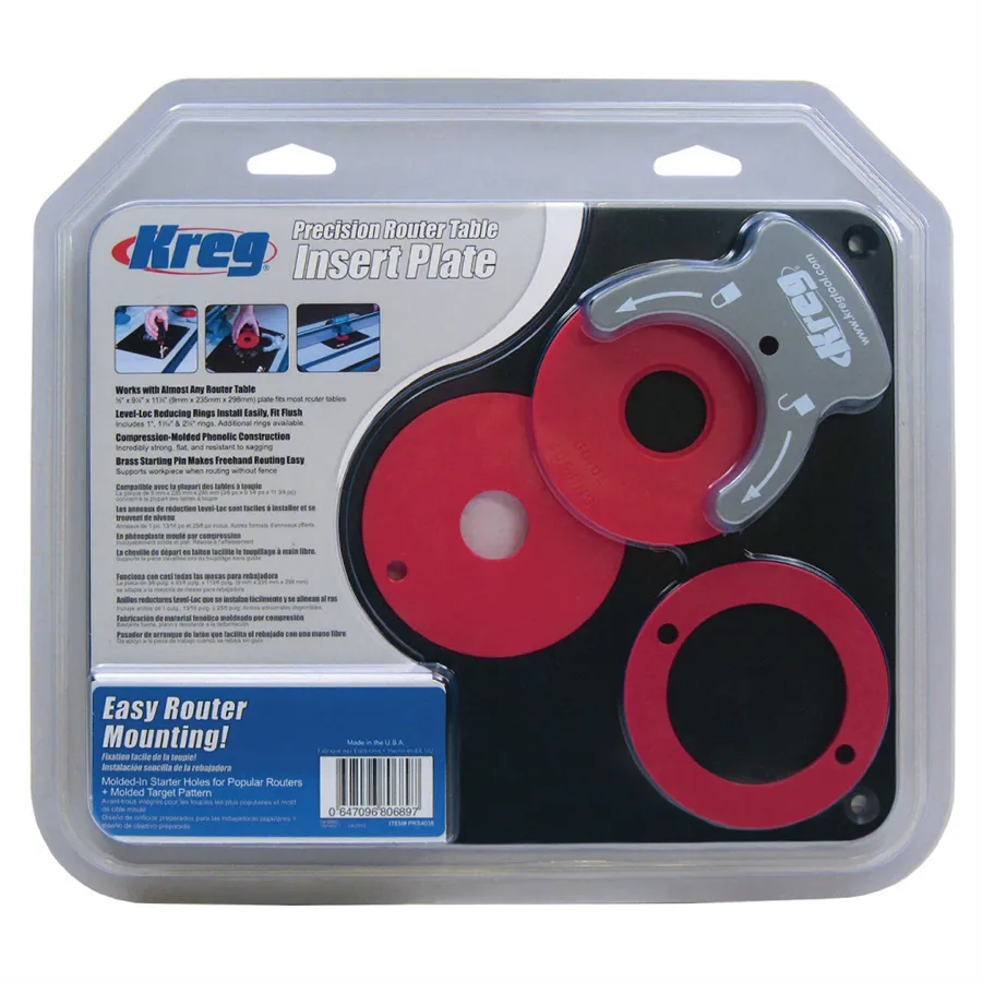 Deska je vybavena středovými kroužky Level-Loc, které Vám umožňují snadno změnit velikost otvoru kolem frézovacího bitu. Kroužky namontujete na desku pomocí dodávaného klíče.