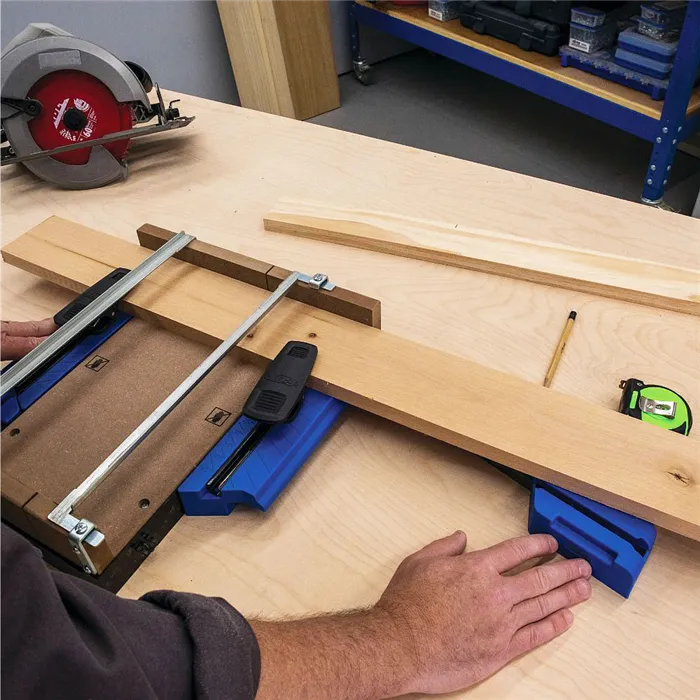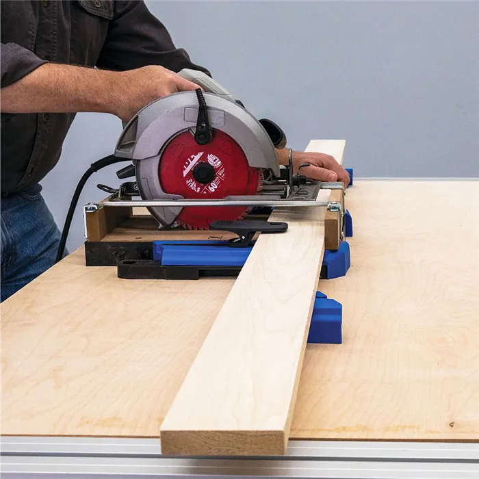 • Přípravek pro přesné příčné řezání ruční kotoučovou pilou.