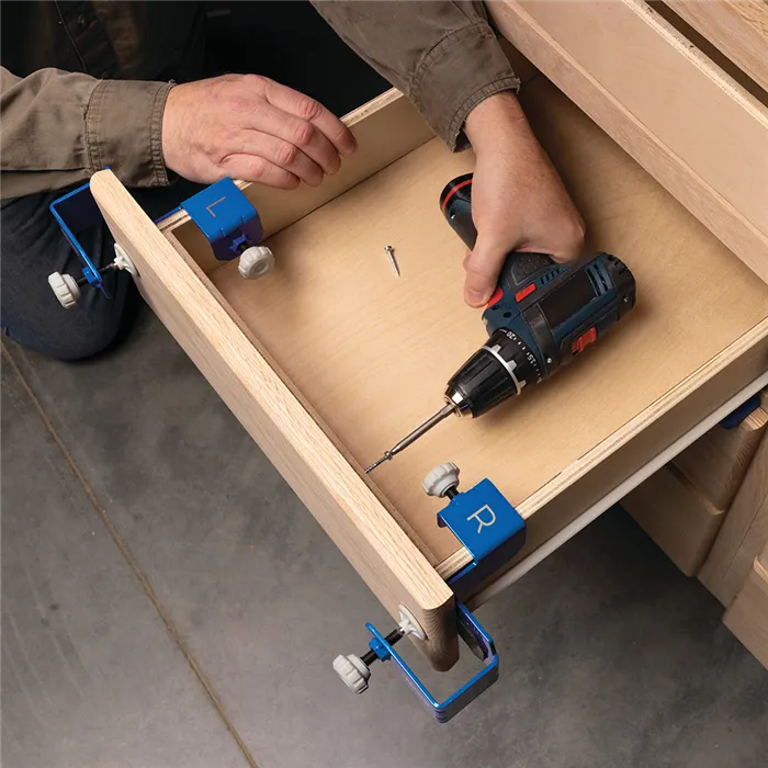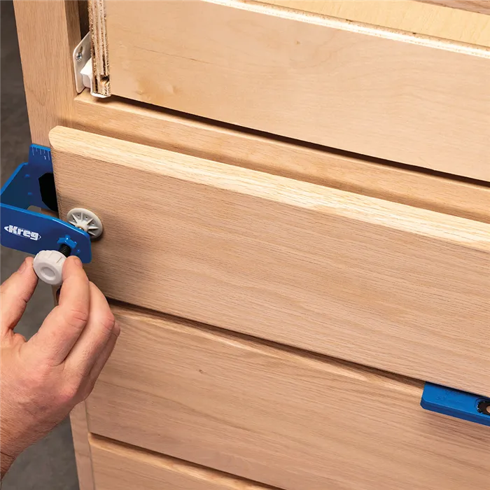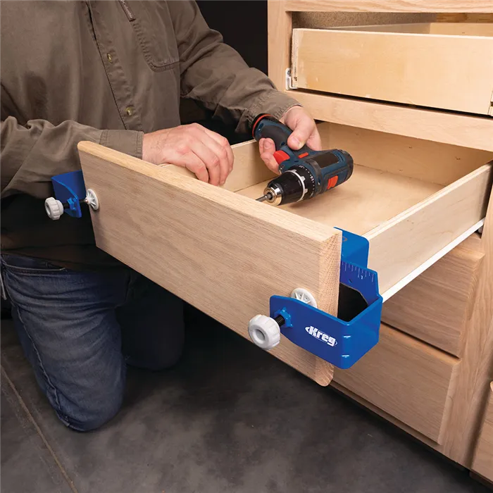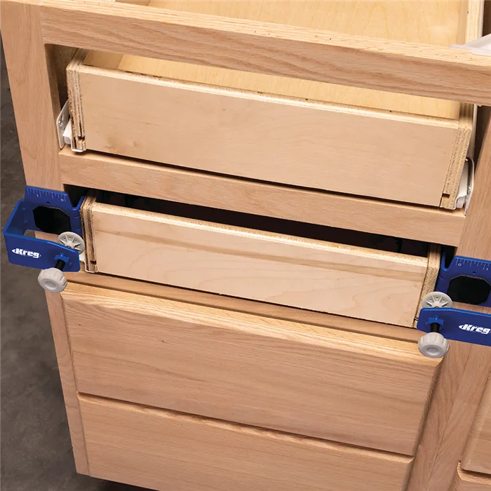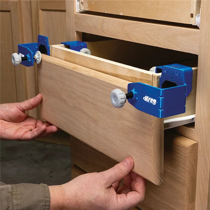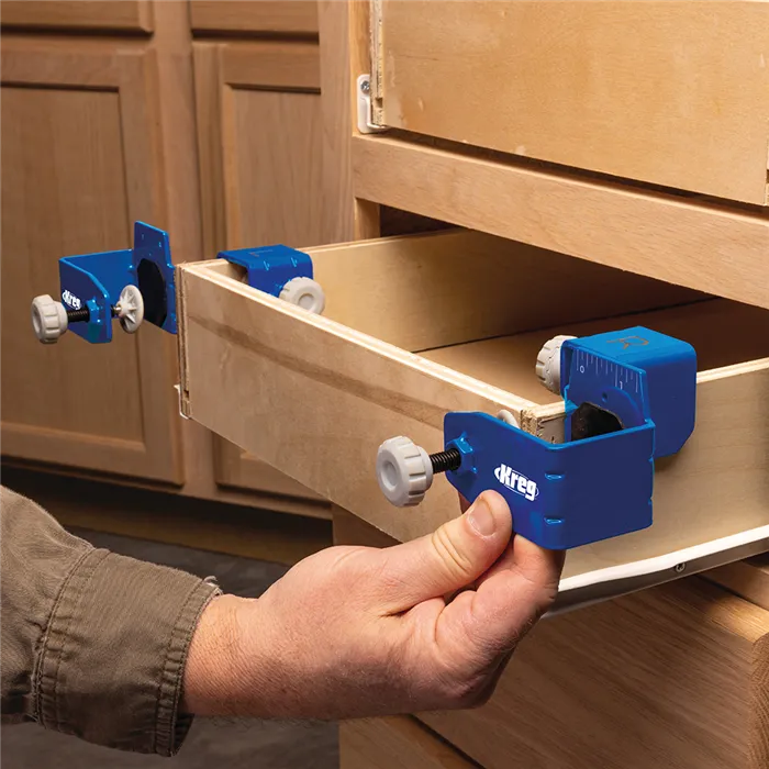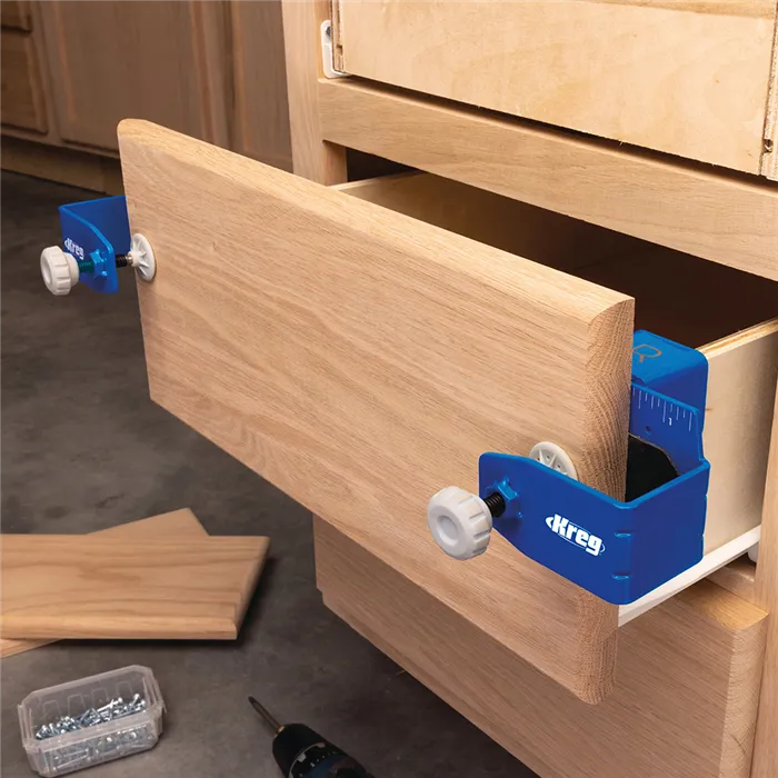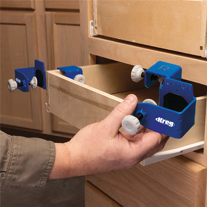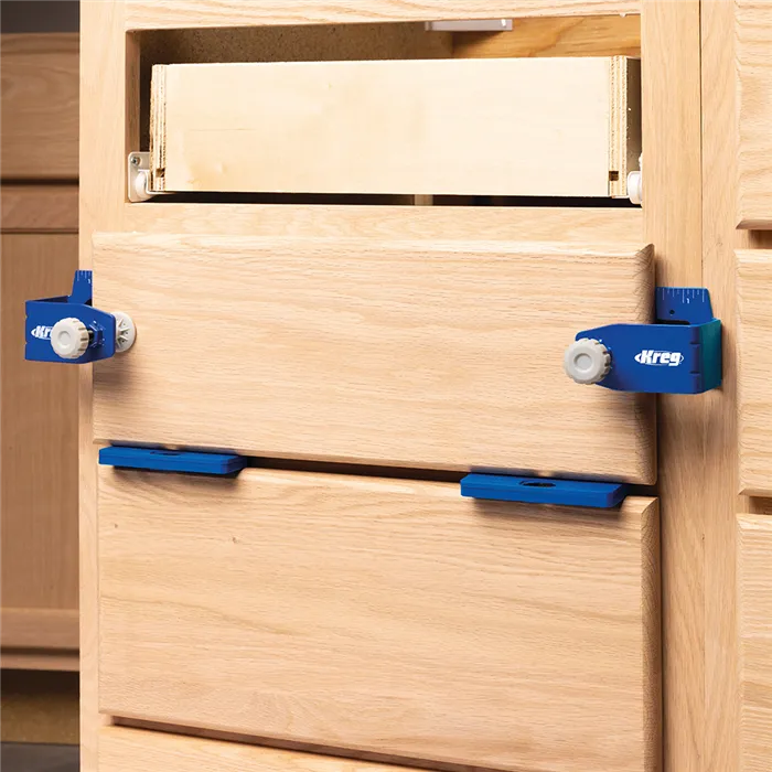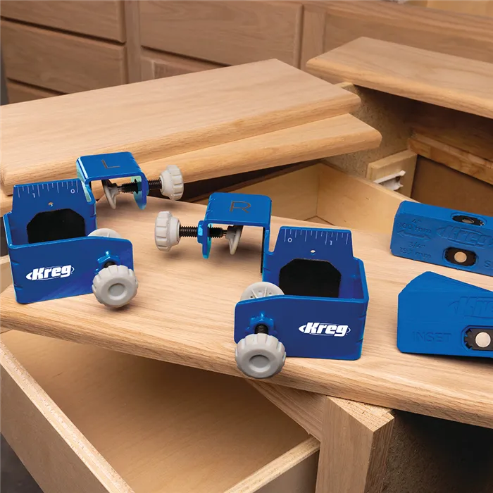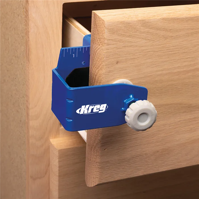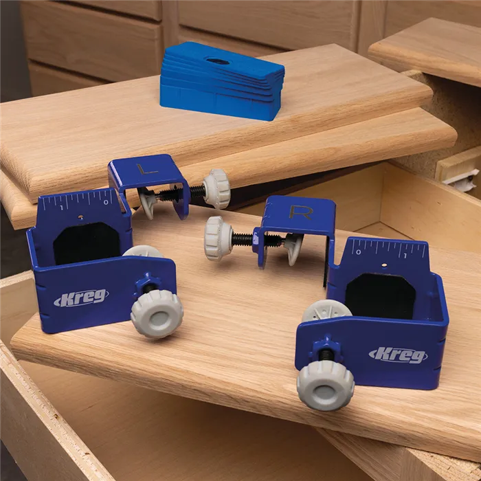 S tímto Kreg Přípravkem můžete jednoduše a rychle montovat, opravovat, přesně vyrovnat a odsadit čela zásuvek. Pevná konstrukce z oceli, velké dosedací plochy s povrchem GripMaxx a rohy s rýhami minimalizují ohyb přípravku a drží čelo pevně na místě.Přípravek Vám výrazně usnadní práci. Čelo stačí jen upnout, vyrovnat a přimontovat bez přidržování rukama.Přípravek se skládá z levé a pravé části a je dodáván se sedmi distančními podložkami pro stejné odsazení čel. Podložky jsou magnetické, o tloušťce 2 mm (2x), 3 mm (2x), 6 mm (2x) a 19 mm (1x).• Konstrukce z oceli a rohy s rýhami minimalizují ohyb přípravku.• Protiskluzový povrch GripMaxx drží materiál pevně na místě a nikdy jej neponičí.• Přesná montáž díky vyrovnávacím značkám.• Velké knoflíky pro snadné upínání/povolování.• Součástí je 7 Kreg Distančních podložek pro montáž čel zásuvek.