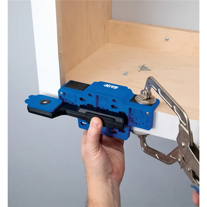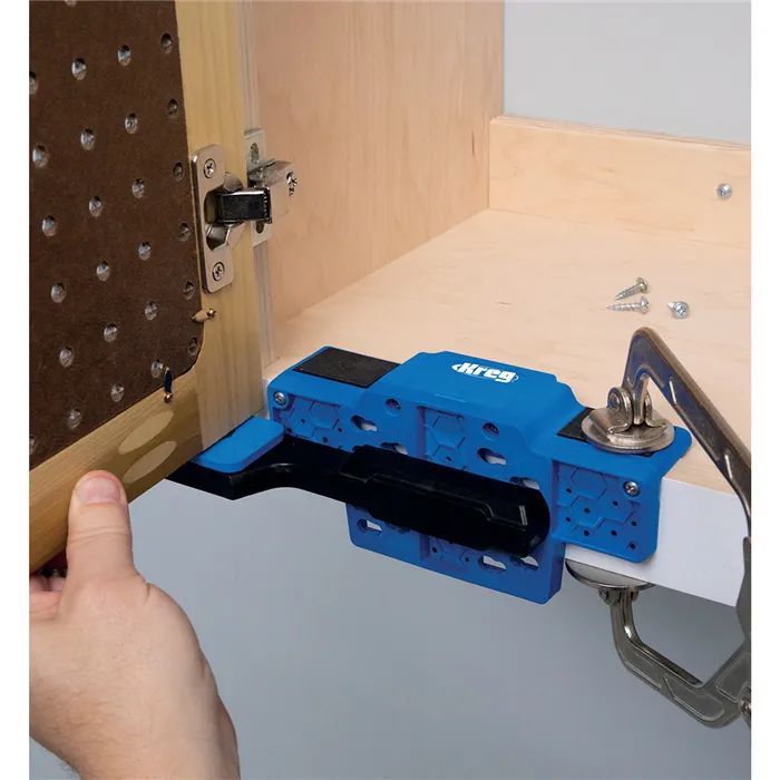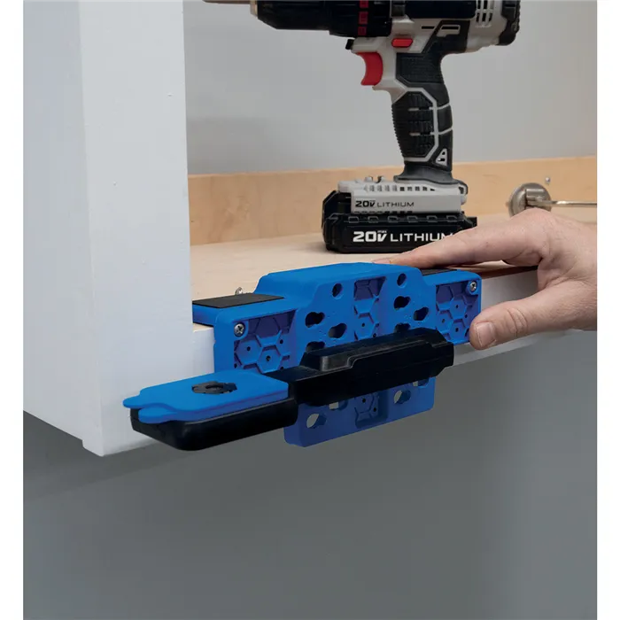 S Kreg Přípravkem pro montáž dvířek již nebudete potřebovat pomoc při montáži dvířek nebo čel skříněk. Přípravek poskytuje oporu, což Vám umožní držet dvířka jednou rukou, zatímco druhou můžete připevnit panty. Oporu lze nastavit do devíti různých poloh. Dvířka tak připevníte vždy přesně a jednoduše. Přípravek je vhodný pro montáž levých i pravých dvířek.