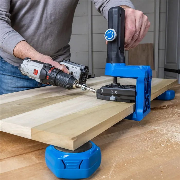Díky odsazení obrobku od stolu můžete pod obrobek bez problému umístit například i svěrku, což se hodí při vrtání skrytých šroubových spojů Pocket nebo při spojování dílců.