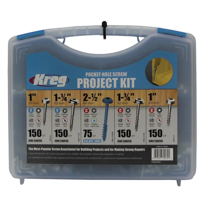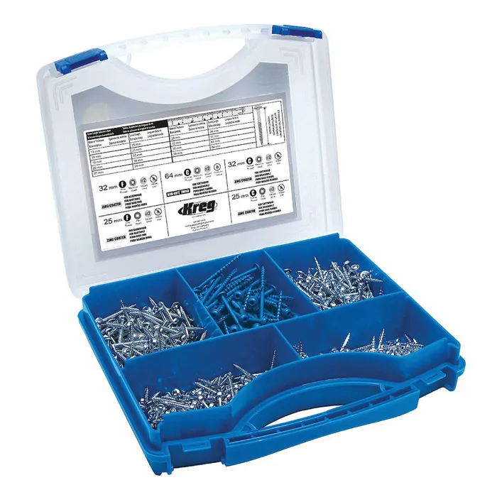 Projekt sada obsahuje pět nejpoužívanějších Kreg Šroubů pro skryté spoje, uložených v pevném pouzdře. Vhodné pro začátečníky s Kreg přípravky.Průměry šroubů:#8 - Šrouby s hrubým závitem SML (s výjimkou nerezových).#7 - Šrouby s jemným závitem SML a všechny šrouby s hrubým závitem SPS.#6 - Šrouby s jemným závitem SPS.Součást balení:• SPS-F1, 25 mm, 150 ks• SPS-C1, 25 mm, 150 ks• SML-F125, 32 mm, 150 ks• SML-C125, 32 mm, 150 ks• SML-C250B, 64 mm, 75 ks
